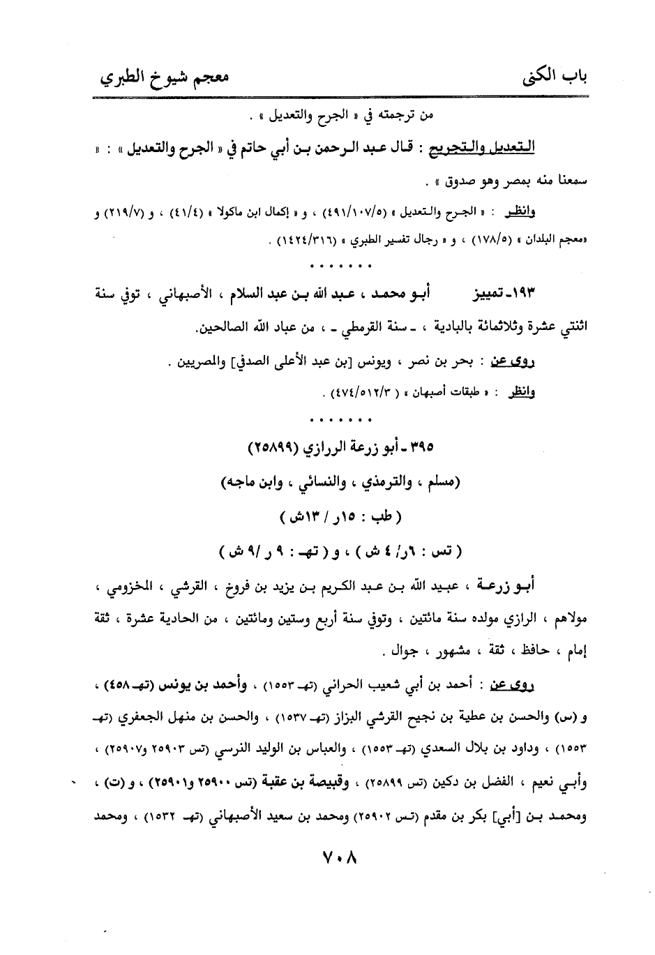 وانظر: “ الجرح والتعديل “ (5/ 107 / 491)، و“ إكمال ابن ماكولا “ (4/ 41)، و (7/ 219) و“ معجم البلدان “ (5/ 178)، و“ رجال تفسير الطبري “ (316/ 1424).