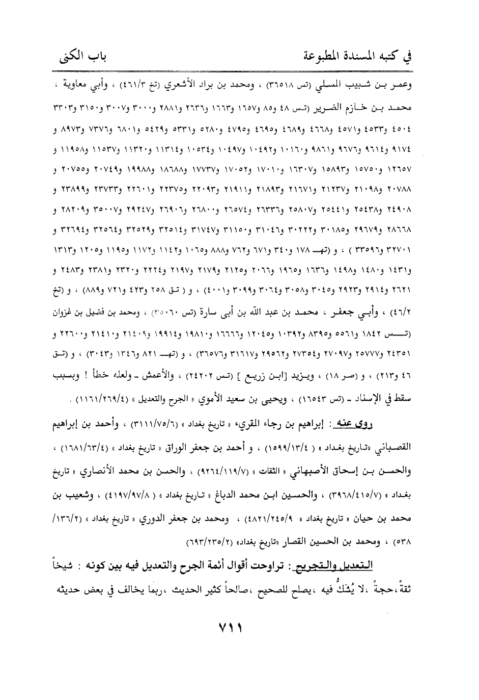 وعمر بن شبيب المسلي (تس 36518)، ومحمد بن براد الأشعري (تخ 3/ 461)، وأبي معاوية: محمد بن خازم الضرير (تس 48 و85 و1657 و1663 و2636 و2881 و3000 و3007 و31150 و3303 و4504 و4533 و4571 و4668 و4689 و4695 و4795 و5280 و5331 و5429 و6801 و7376 و8973 و9174 و9614 و9676 و9861 و10160 و10492 و10497 و10534 و11314 و11320 و11537 و11958 و12657 و15750 و15893 و16307 و17010 و17052 و17737 و18688 و19988 و20749 و20755 و20788 و21098 و21237 و21671 و21893 و21911 و22093 و22375 و22601 و23733 و23899 و24908 و25438 و25441 و25807 و26336 و26574 و26800 و26906 و29247 و35007 و28209 و28668 و29679 و30185 و30222 و31046 و31150 و31747 و32514 و32529 و32564 و32694 و32701 و33596)، و (تهـ 178 و340 و671 و762 و888 و1065 و1142 و1172 و1195 و1205 و1313 و1431 و1480 و1498 و1636 و1965 و2066 و2125 و2179 و2197 و2224 و2320 و2381 و2621 و2914 و2923 و3045 و3058 و3064 و3099 و4001)، و (تق 258 و423 و721 و889 و (تخ 2/ 46)، وأبي جعفر، محمد بن عبد الله بن أبي سارة (تس 35060)، ومحمد بن فضيل بن غزوان (تس 1842 و5561 و8395 و10392 و12045 و16666 و19810 و19914 و21409 و21410 و22600 و24351 و25777 و27097 و27354 و29562 و31617 و36576)، و (تهـ 821 و1346 و3043 و (تق 46 و213)، و (صر 18)، ويزيد (ابن زريع) (تس 24202)، والأعمش - ولعله خطأ! وبسبب سقط في الإسناد - (تس 16543)، ويحيى بن سعيد الأموي “ الجرح والتعديل “ (4/ 269 / 1161).