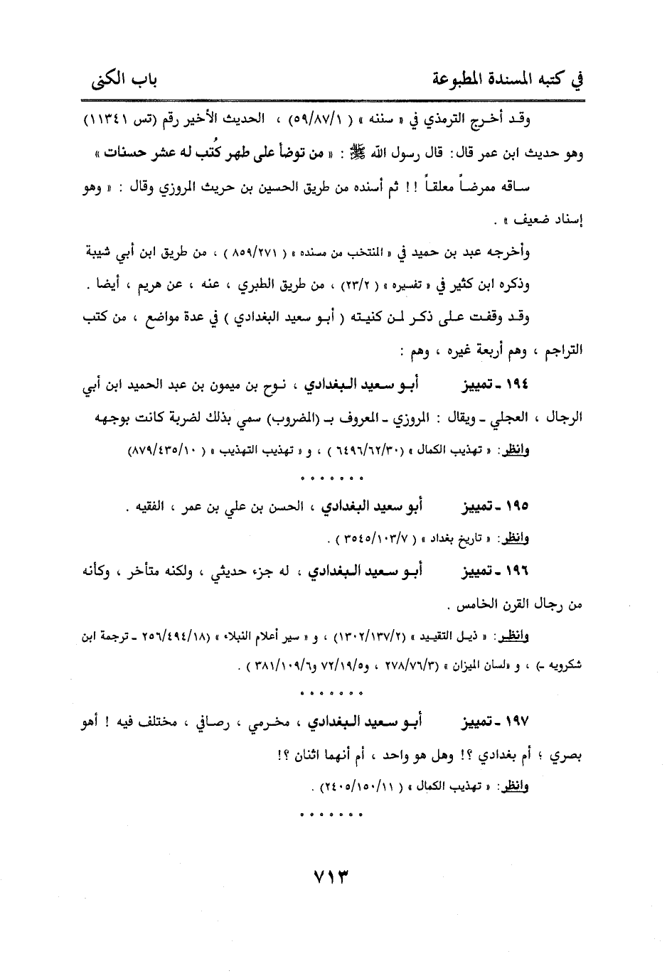 وقد أخرج الترمذي في “ سننه “ (1/ 87 / 59)، الحديث الأخير رقم (تس 11341) وهو حديث ابن عمر قال: قال رسول الله صلى الله عليه وسلم: “ من توضأ على طهر كتب له عشر حسنات “، ساقه ممرضا معلقا!! ثم أسنده من طريق الحسين بن حريث المروزي وقال: “ إسناده ضعيف “.
