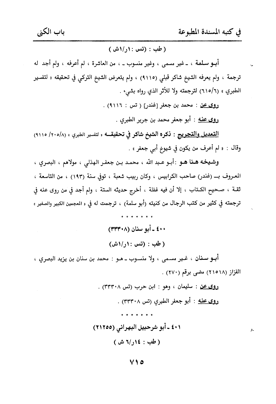 التعديل والتجريح: ذكره الشيخ شاكر في تحقيقه “ لتفسير الطبري “ (8/ 205 / 9115) وقال: “ لم أعرف من يكون في شيوخ أبي جعفر “.