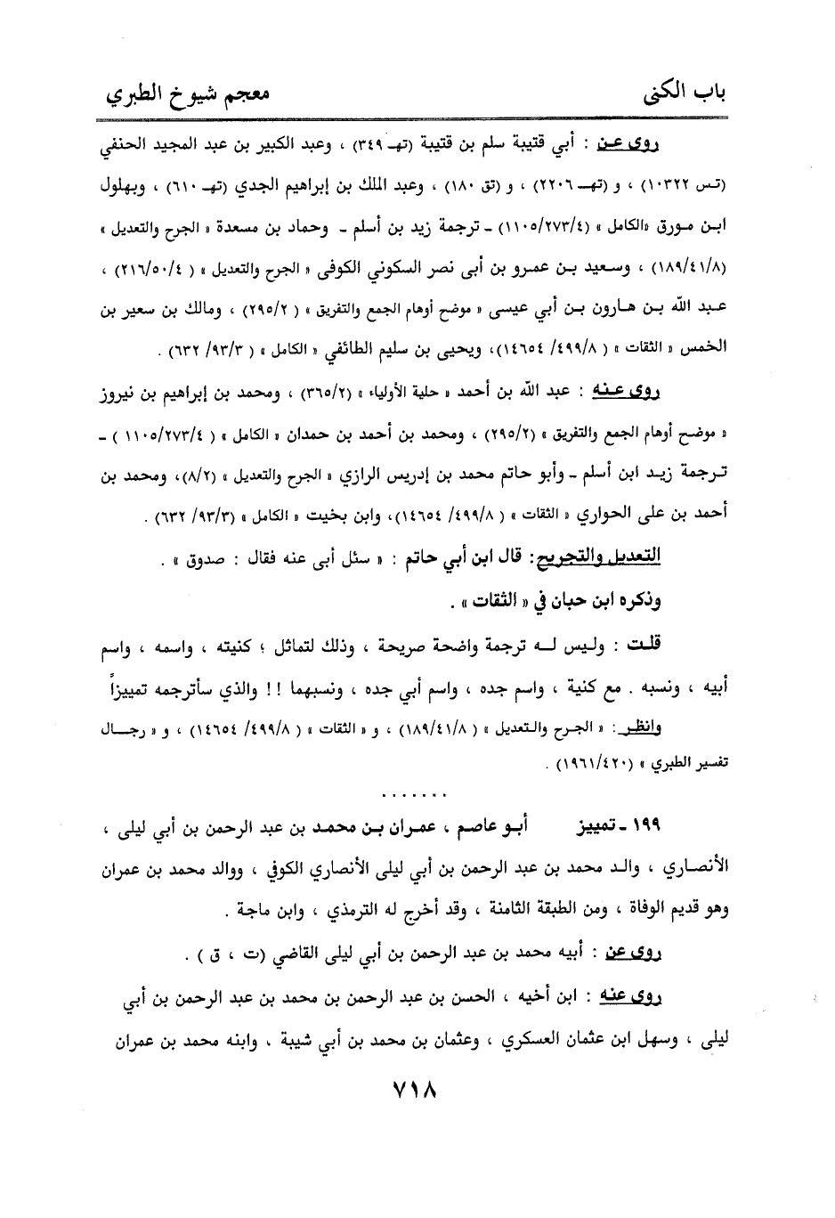 199 - تمييز أبو عاصم، عمران بن محمد بن عبد الرحمن بن أبي ليلى، الأنصاري، والد محمد بن عبد الرحمن بن أبي ليلى الأنصاري الكوفي، ووالد محمد بن عمران وهو قديم الوفاة، ومن الطبقة الثامنة، وقد أخرج له الترمذي، وابن ماجه.