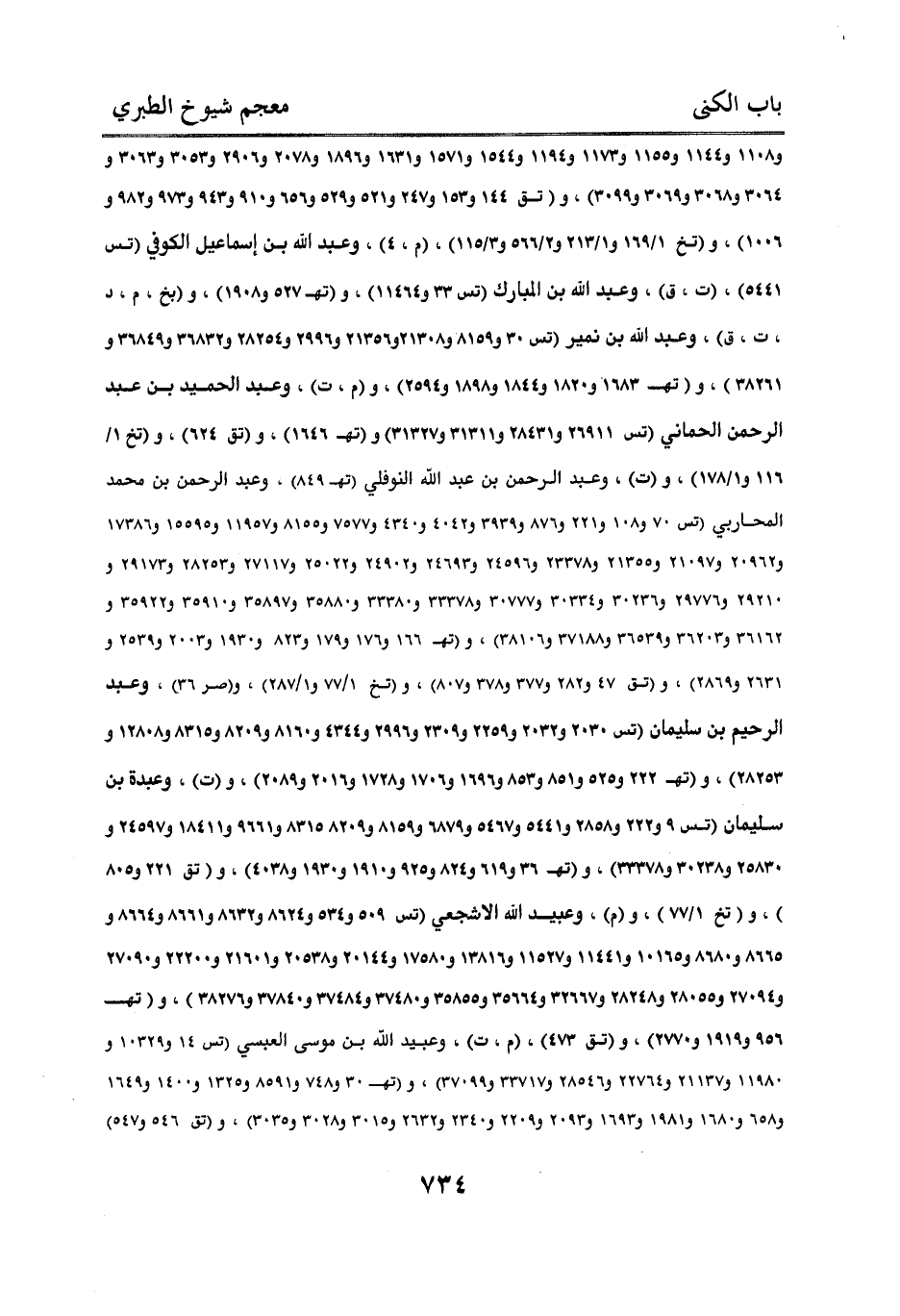 و1108 و1144 و1155 و1173 و1194 و1544 و1571 و1631 و1896 و2078 و2906 و3053 و3063 و3064 و3068 و3069 و3099)، و (تق 144 و153 و247 و521 و529 و656 و910 و943 و973 و982 و1006) و (تخ 1/ 169 و1/ 213 و2/ 566 و3/ 115)، (م، 4)، وعبد الله بن إسماعيل الكوفي (تس 5441)، (ت، ق)، وعبد الله بن المبارك (تس 33 و11464)، و (تهـ 527 و1908)، و (بخ، م، د، ت، ق)، وعبد الله بن نمير (تس 30 و8159 و21308 و21356 و2996 و28254 و36832 و36849 و38261)، و (تهـ 1683 و1820 و1844 و1898 و2594)، و (م، ت) " وعبد الحميد بن عبد الرحمن الحماني (تس 26911 و28431 و31311 و31327) و (تهـ 1646)، و (تق 624): و (تخ 1/ 116 و1/ 178)، و (ت)، وعبد الرحمن بن عبد الله النوفلي (تهـ 849). وعبد الرحمن بن محمد المحاربي (تس 70 و108 و221 و876 و3939 و4042 و4340 و7577 و8155 و11957 و15595 و17386 و20962 و21097 و21355 و23378 و24596 و24693 و24902 و25022 و27117 و28253 و29173 و29210 و29776 و30236 30334 و30777 و33378 و33380 و35880 و35897 و35910 و35922 و36162 و36203 و36539 و37188 و38106) و (تهـ 166 و176 و179 823 و1930 و2003 و2539 و2631 و2869)، و (تق 47 و282 و377 و378 و807)، و (تخ 1/ 77 و1/ 287)، و (صر 36)، وعبد الرحيم بن سليمان (تس 2030 و2032 و2259 و2309 و2996 و4344 و8160 و8209 و8315 و12808 و28253)، و (تهـ 222 و525 و851 و853 و1696 و1706 و1728 و2016 و2089)، و (ت)، وعبدة بن سليمان (تس 9 و222 و2858 و5441 و5467 و6879 و8159 و8209 و8315 و9661 و18411 و24597 و25830 و30238 و33378)، و (تهـ 36 و619 و824 و925 و1910 و1930 و4038)، و (تق 221 و805)، و (تخ 1/ 77)، و (م)، وعبيد الله الأشجعي (تس 509 و534 و8624 و8632 و8661 و8664 و8665 و8680 و10165 و11441 و11527 و13816 و17580 و20144 و20538 و21601 و22200 و27090 و27094 و28055 و28248 و32667 و35664 و35855 و37480 و37484 و37840 و38276)، و (تهـ 956 و1919 و2770)، و (تق 473)، (م، ت)، وعبيد الله بن موسى العبسي (تس 14 و10329 و11980 و21137 و22764 و28546 و33717 و37099)، و (تهـ 30 و748 و8591 و1325 و1400 و1649 و658 و1680 و1981 و1693 و2093 و2209 و2340 و2632 و3015 و3028 و3035)، و (تق 546 و547)،