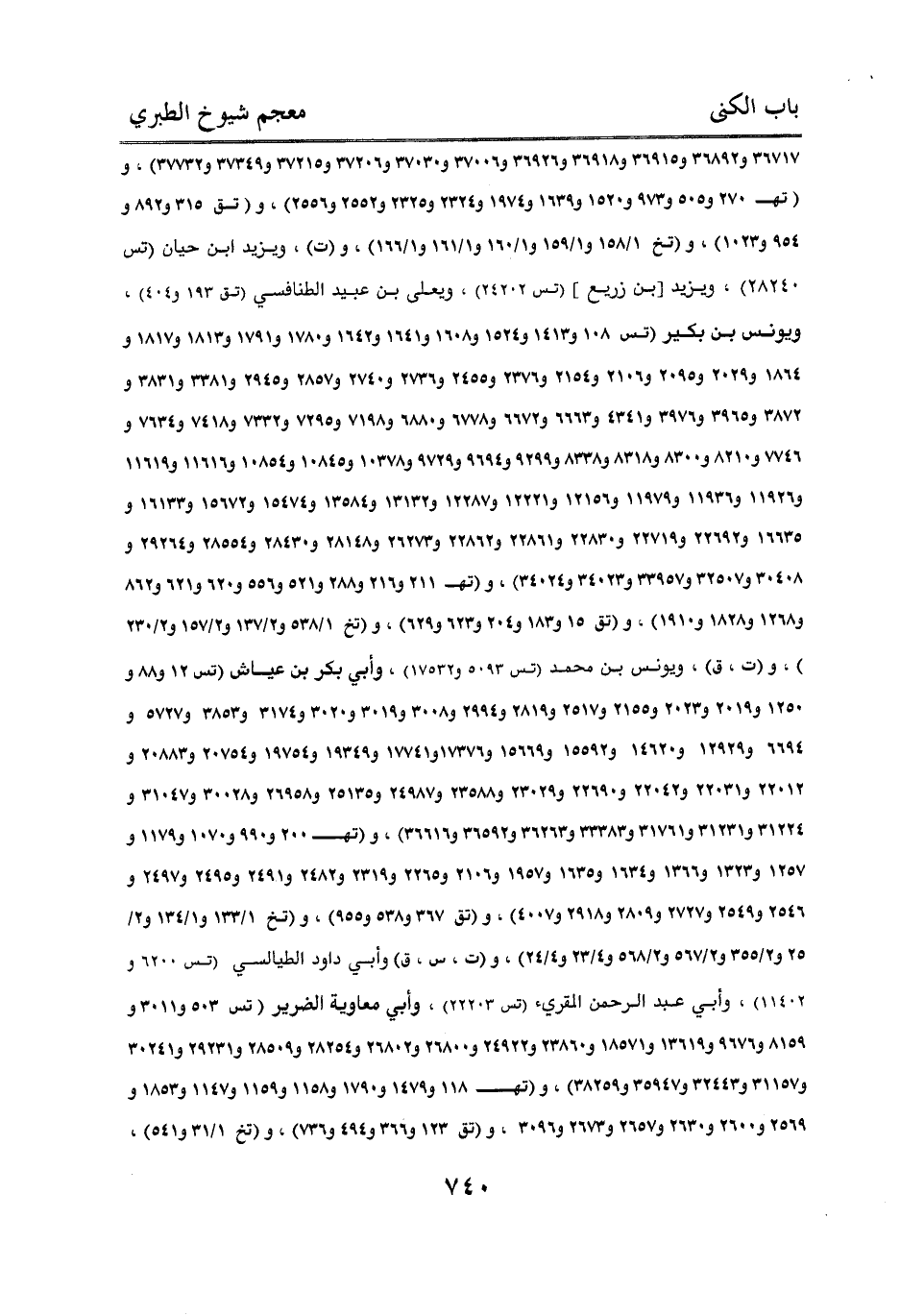 و36717 و36892 و36915 و36918 و36926 و37006 و37030 و37206 و37215 و37349 و37732)، و (تهـ 270 و505 و973 و1520 و1639 و1974 و2324 و2325 و2552 و2556)، و (تق 315 و892 954 و1023)، و (تخ 1/ 158 و1/ 159 و1/ 160 و1/ 161 و1/ 166)، و (ت)، ويزيد بن حيان (تس 28240) ويزيد [بن زريع] (تس 24202) ويعلى بن عبيد الطنافسي (تق 193 و404)، ويونس بن بكير (تس 108 و1413 و1524 و1608 و1641 و1642 و1780 و1791 و1813 و1817 و1864 و2029 و2095 و2106 و2154 و2376 و2455 و2736 و2740 و2857 و2945 و3381 و3831 و3872 و3965 و3976 و4341 و6663 و6672 و6778 و6880 و7198 و7295 و7332 و7418 و7634 و7746 و8210 و8300 و8318 و8338 و9299 و9694 و9729 و10378 و10854 و11616 و11619 و11926 و11936 و11979 و12156 و12221 و12287 و13132 و13584 و15474 و15672 و16133 و16635 و22692 و22719 و22830 و22861 و22862 و26273 و28148 و28430 و28554 و29264 و30408 و32507 و33957 و34023 و34024)، و (تهـ 211 و216 و288 و521 و556 و620 و621 و862 و1268 و1828 و1910) و (تق 15 و183 و204 و623 و629) و (تخ 1/ 538 و2/ 137 و2/ 157 و2/ 320) و (ت، ق) ويونس بن محمد (تس 5093 و17532) وأبي بكر بن عياش (تس 12 و88 و1250 و2019 و2023 و2155 و2517 و2819 و2994 و3008 و3019 و3020 و3174 و3853 و5727 و6694 و12929 و14620 و15592 و15669 و17376 و17741 و19349 و19754 و20754 و20883 و22012 و22031 و22042 و22690 و23029 و23588 و24987 و25135 و26958 و30028 و31047 و31224 و31231 و31761 33383 و36263 و36592 و36616) و (تهـ 200 و990 و1070 و1179 و1257 و1323 و1366 و1634 و1635 و1957 و2106 و2265 و2319 و2482 و2491 و2495 و2497 و2546 و2549 و2727 و2809 و2918 و4007) و (تق 367 و538 و955) و (تخ 1/ 133 و1/ 134 و2/ 25 و2/ 355 و2/ 567 و2/ 568 و4/ 23 و4/ 24) و (ت، س، ق) وأبي داود الطيالسي (تس 6200 و11402) وأبي عبد الرحمن المقريء (تس 22203) وأبي معاوية الضرير (تس 503 و3011 و8159 و9676 و13619 و18571 و23860 و24922 و26800 و26802 و28254 و28509 و29231 و30241 و31157 و32442 و35947 و38259) و (تهـ 118 و1479 و1790 و1158 و1159 و1147 و1853 و2569 و2600 و2630 و2657 و2673 و3096) (تق 123 و366 و494 و736) و (تخ 1/ 31 و541)