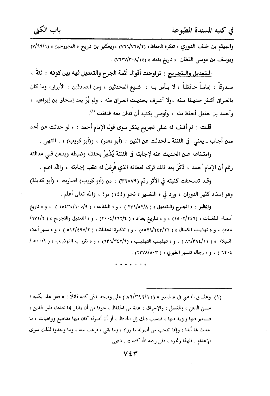 والهيثم بن خلف الدوري “ تذكرة الحفاظ “ (2/ 765 / 766)، ويعكبر بن ذريح “ المجروحين “ (1/ 99 / 7) ويوسف بن موسى القطان “ تاريخ بغداد “ (14/ 308 / 7627).