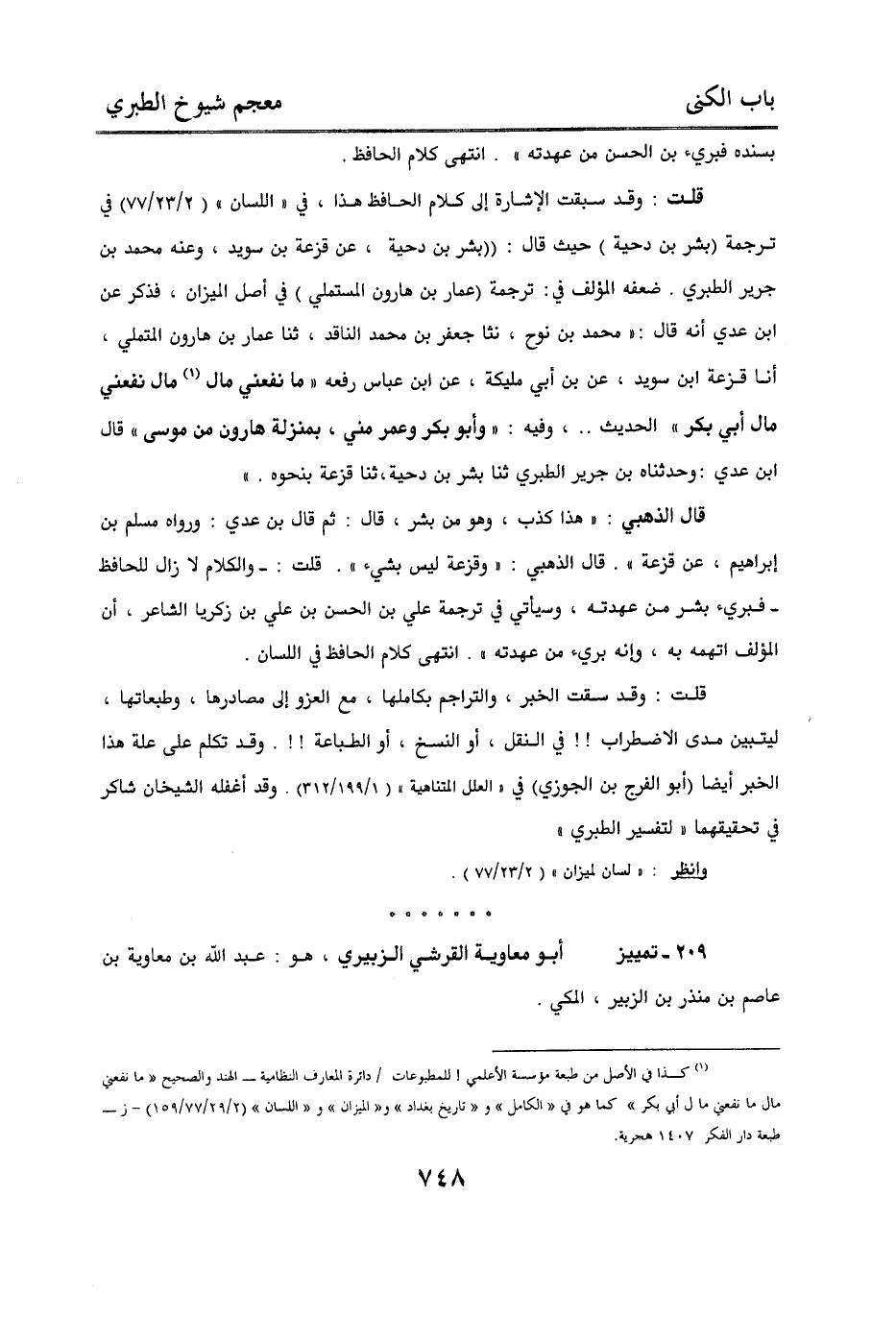 قلت: وقد سقت الخبر، والتراجم بكاملها، مع العزو إلى مصادرها، وطبعاتها، ليتبين مدى الاضطراب!! في النقل، أو النسخ، أو الطباعة!!. وقد تكلم على علة هذا الخبر أيضا (أبو الفرج بن الجوزي) في “ العلل المتناهية “ (1/ 199 / 312). وقد أغفله الشيخان شاكر في تحقيقهما “ لتفسير الطبري “.