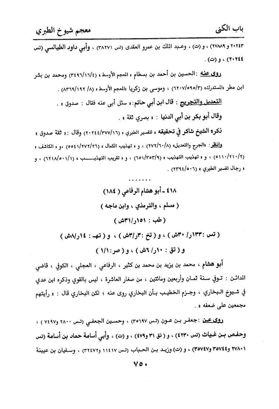 أبو هشام، محمد بن يزيد بن محمد بن كثير، الرفاعي، العجلي، الكوفي، قاضي المدائن: توفي سنة ثمان وأربعين ومائتين، من صغار العاشرة، ليس بالقوي وذكره ابن عدي في شيوخ البخاري، وجزم الخطيب بأن البخاري روى عنه؛ لكن البخاري قال: “ رأيتهم مجمعين على ضعفه “.
