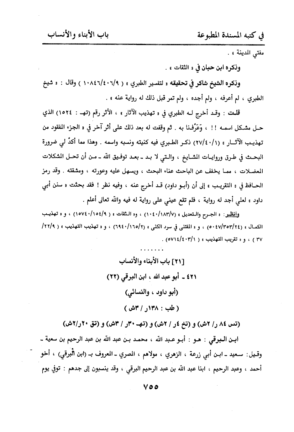 قلت: وقد أخرج له الطبري في " تهذيب الآثار "، الأثر رقم (تهـ: 1524) الذي حل مشكل اسمه.!!، وعرفنا به. ثم وقفت له بعد ذلك على أثر آخر في " الجزء المفقود من تهذيب الآثار " (1/ 40 / 27) ذكر الطبري فيه كنيته ونسبه واسمه. وهذا مما أكد لي ضرورة البحث في طرق وروايات المشايخ، والتي لا بد - بعد توفيق الله - من أن تحل المشكلات المعضلات، مما يخفف عن الباحث عناء البحث، ويسهل عليه وعورته، ومشقته. وقد رمز الحافظ في " التقريب " إلى أن (أبو داود) قد أخرج عنه، وفيه نظر! فقد بحثت " سنن أبي داود "، لعلي أجد له رواية، فلم تقع عيني على رواية له فيه. والله تعالى أعلم.
