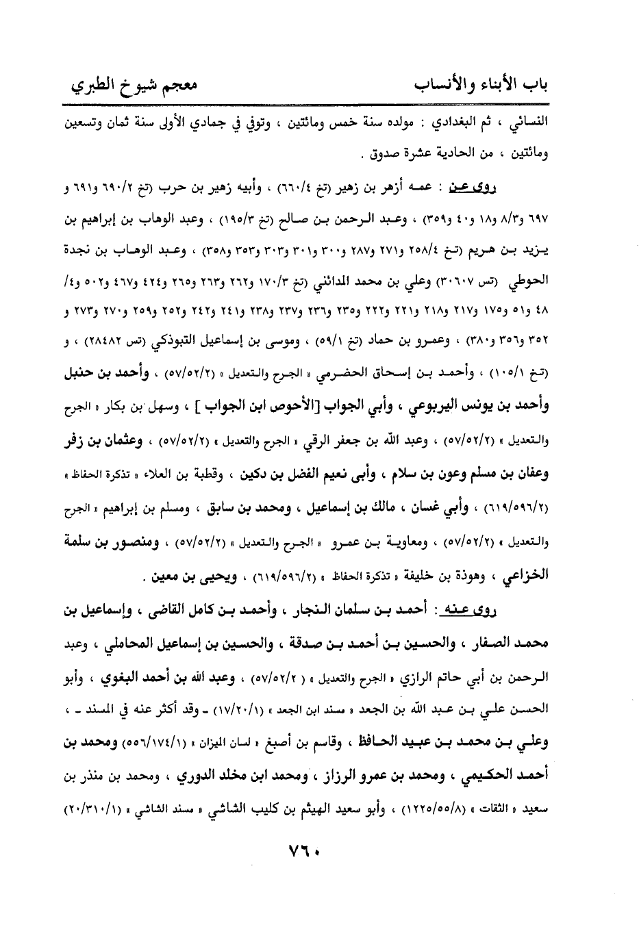 روى عن: عمه أزهر بن زهير (تخ 4 و660)، وأبيه زهير بن حرب (تخ 2/ 690 و691 و697 و3/ 8 و18 و40 و359)، وعبد الرحمن بن صالح (تخ 3/ 195) وعبد الوهاب بن إبراهيم بن يزيد بن هريم (تخ 4/ 258 و271 و287 و300 و301 و303 و353 و358)، وعبد الوهاب بن نجدة الحوطي (تس 30607) وعلي بن محمد المدائني (تخ 3/ 170 و262 و263 و265 و424 و467 و502 و4/ 48 و51 و175 و217 و218 و221 و222 و235 و236 و237 و238 و241 و242 و252 و259 و270 و273 و352 و256 و380)، وعمرو بن حماد (تخ 1/ 59)، وموسى بن إسماعيل التبوذكي (تس 28482)، و (تخ 1/ 105)، وأحمد بن إسحاق الحضرمي، الجرح والتعديل “ (2/ 52 / 57)، وأحمد بن حنبل وأحمد بن يونس اليربوعي، وأبي الجواب (الأحوص بن الجواب)، وسهل بن بكار “ الجرح والتعديل “ (2/ 52 / 57)، وعبد الله بن جعفر الرقي “ الجرح والتعديل “ (2/ 52 / 57)، وعثمان بن زفر وعفان بن مسلم وعون بن سلام، وأبي نعيم الفضل بن دكين، وقطبة بن العلاء “ تذكرة الحفاظ “ (2/ 596 / 619)، وأبي غسان، مالك بن إسماعيل، ومحمد بن سابق، ومسلم بن إبراهيم “ الجرح والتعديل “ (2/ 52 / 57)، ومعاوية بن عمرو “ الجرح والتعديل “ (2/ 52 / 57)، ومنصور بن سلمة الخزاعي، وهوذة بن خليفة “ تذكرة الحفاظ “ (2/ 596 / 619)، ويحيى بن معين.