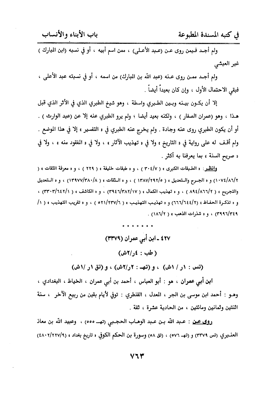 إلا أن يكون بينه وبين الطبري واسطة، وهو شيخ الطبري الذي في الأثر الذي قبل هذا، وهو (عمران الصفار)، ولكنه بعيد أيضا؛ ولم يرو الطبري عنه إلا عن (عبد الوارث). أو أن يكون الطبري روى عنه وجادة. ولم يخرج عنه الطبري في “ التفسير “ إلا في هذا الموضع.