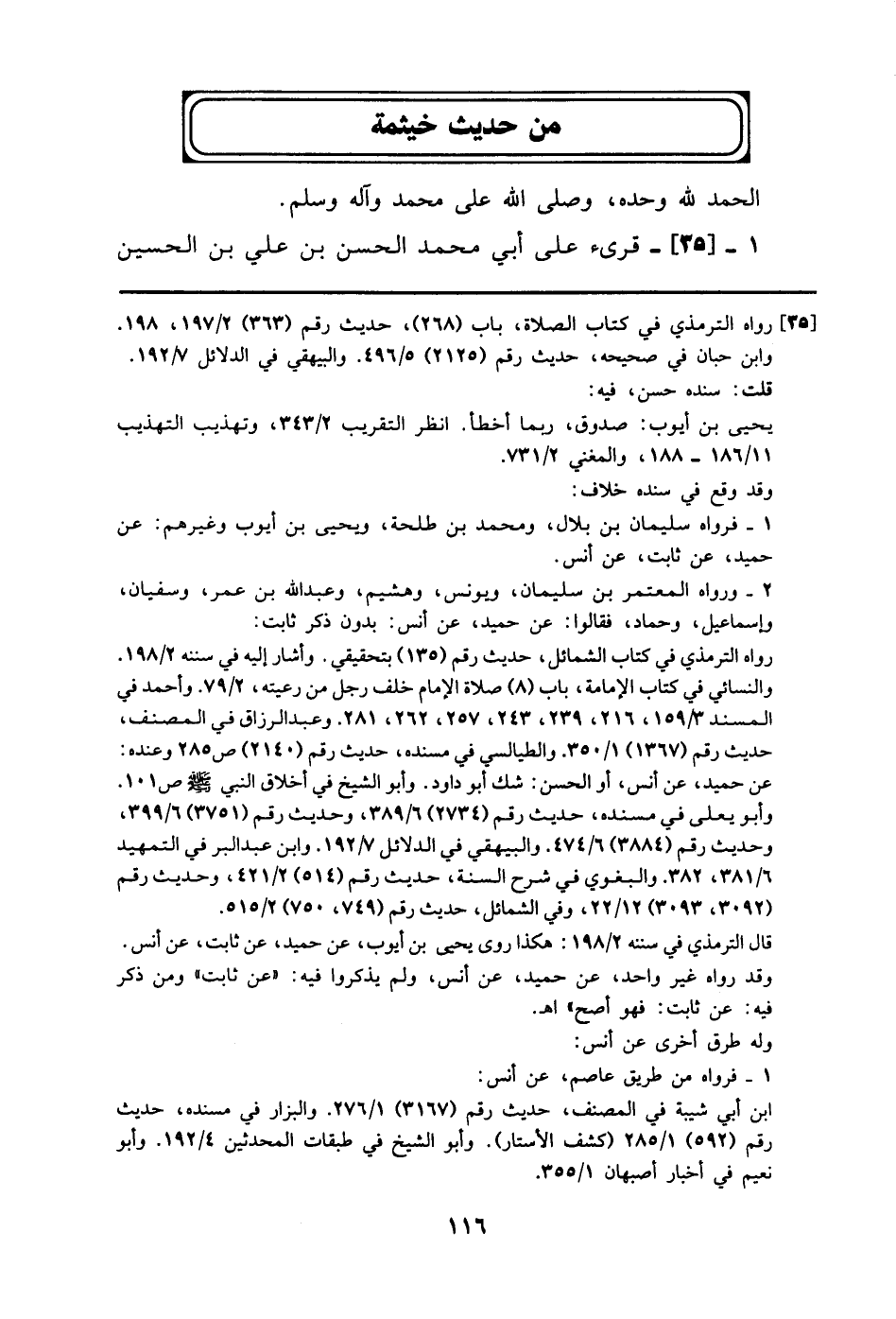 1 - (35) قرئ على أبي مُحَمَّد الحَسَن بن علي بن الحُسَين -[117]- ونحن نسمع بدمشق قيل له أخبركم جدكم أَبُو الْقَاسِمِ الحُسَين أَنبأ -[118]- أَبُو الْقَاسِمِ عَلِيُّ بن مُحَمَّد بن علي المصيصي أَنَبا أبو نصر بن مُحَمَّد بن أحمد بن هارون بن موسى أَخْبَرنَا أبو الحَسَن خيثمة بن سليمان بن حيدرة قراءةً عليه في سنة ثلاث وأربعين وثلاثمائة: حَدَّثَنا إسحاق بن سيار أبو يعقوب النصيبي حَدَّثَنا عَمْرُو بْنُ الرَّبِيعِ قَالَ: حَدَّثَنِي يَحْيَى بْنُ أَيُّوبَ عَنْ حُمَيْدٍ قَالَ: حَدَّثَنِي ثَابِتٌ الْبُنَانِيُّ عَنْ أَنَسٍ: أَنّ رَسُولَ اللَّهِ صَلَّى اللَّهُ عَلَيْهِ وَسَلَّمَ صَلَّى خَلْفَ أَبِي بَكْرٍ فِي ثوب واحد فخالف بَيْنَ طَرَفَيْهِ. فَلَمَّا أَرَادَ أَنْ يَقُومَ قَالَ ادْعُوا لِي أُسَامَةَ. فَجَاءَهُ فَأَسْنَدَ ظَهْرَهُ إِلَى نحره فكانت آخر صلاته صَلاهَا رَسُولُ اللَّهِ صَلَّى اللَّهُ عَلَيْهِ وَسَلَّمَ.