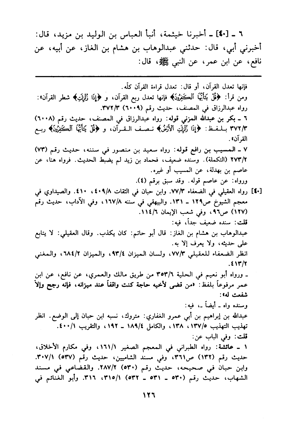 6 - (40) أخبرنا خيثمة أَخْبَرنَا الْعَبَّاسُ بْنُ الْوَلِيدِ بْنِ مَزْيَدٍ قَالَ: أَخْبَرَنِي أَبِي قَالَ: حَدَّثَنِي عَبْدُ الْوَهَّابِ بْنُ هِشَامِ بْنِ الْغَازِ , عَنْ أَبِيهِ عَنْ نَافِعٍ عَنِ ابْنِ عُمَرَ عَنِ النَّبِيِّ صَلَّى اللَّهُ عَلَيْهِ وَسَلَّمَ قَالَ -[127]- مَنْ كَانَ وَصْلَةً لأَخِيهِ الْمُسْلِمِ إِلَى ذِي سُلْطَانِهِ فِي مَنْفَعَةِ بِرٍّ أَوْ تَيْسِيرِ عُسْرٍ أُعِينَ عَلَى إِجَازَةِ الصِّرَاطِ يَوْمَ دحض الأقدام.