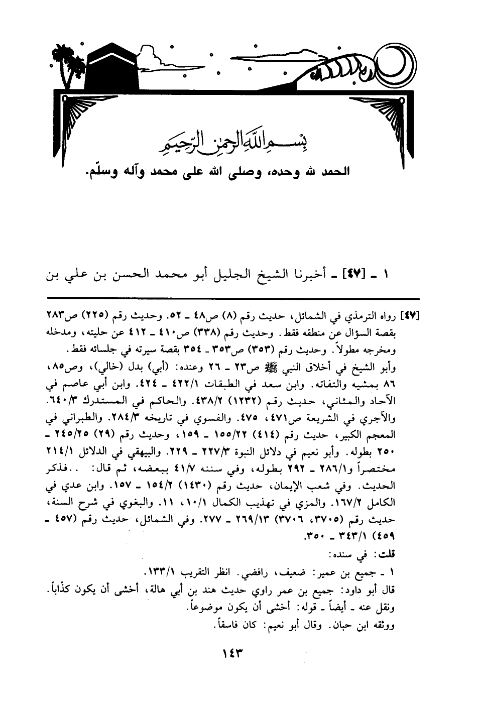 1 - (47) أَخْبَرَنَا الشَّيْخُ الْجَلِيلُ أَبُو مُحَمَّدٍ الْحَسَنُ بْنُ عَلِيِّ بْنِ -[144]- الْحُسَيْنِ بْنِ الْحَسَنِ بْنِ مُحَمَّدٍ الأسدي بقراءتي عليه، قلت له: أخبركم جدك -[145]- أبو القاسم الحسين، أنبأنا أَبُو الْقَاسِمِ عَلِيُّ بْنُ مُحَمَّدِ بْنِ عَلِيِّ بْنِ أَبِي الْعَلاءِ السُّلَمِيُّ الْمِصِّيصِيُّ، أنبا أَبُو مُحَمَّدٍ عَبْدُ الرَّحْمَنِ بْنُ عُثْمَانَ بْنِ الْقَاسِمِ بْنِ مَعْرُوفِ بْنِ أَبِي نَصْرٍ، ثنا أَبُو علي محمد بن هارون بن شعيب الأنصاري، ثنا زَكَرِيَّا بْنُ يَحْيَى السِّجْزِيُّ، ثنا إِسْحَاقُ بْنُ إِبْرَاهِيمَ الْحَنْظَلِيُّ -وَهُوَ ابْنُ رَاهَوَيْهِ- وَعَلِيُّ بْنُ مُحَمَّدِ بْنِ أَبِي الْخَصِيبِ، قَالا: أنبا عَمْرُو بْنُ مُحَمَّدٍ الْعَنْقَزِيُّ، ثنا جُمَيْعُ بْنُ عُمَرَ الْعِجْلِيُّ مِنْ بَنِي ضُبَيْعَةَ، عَنْ رَجُلٍ مِنْ بَنِي تَمِيمٍ يُقَالُ لَهُ يَزِيدُ بْنُ عُمَرَ التَّمِيمِيُّ، مِنْ وَلَدِ أَبِي هَالَةَ، عَنْ أَبِيهِ، عَنِ الْحَسَنِ بْنِ عَلِيِّ بْنِ أَبِي طَالِبٍ رَضِيَ اللَّهُ عَنْهُمَا قَالَ: سَأَلْتُ هِنْدَ بْنَ أَبِي هَالَةَ، وَكَانَ وَصَّافًا لِلنَّبِيِّ صَلَّى اللَّهُ عَلَيْهِ وَسَلَّمَ.