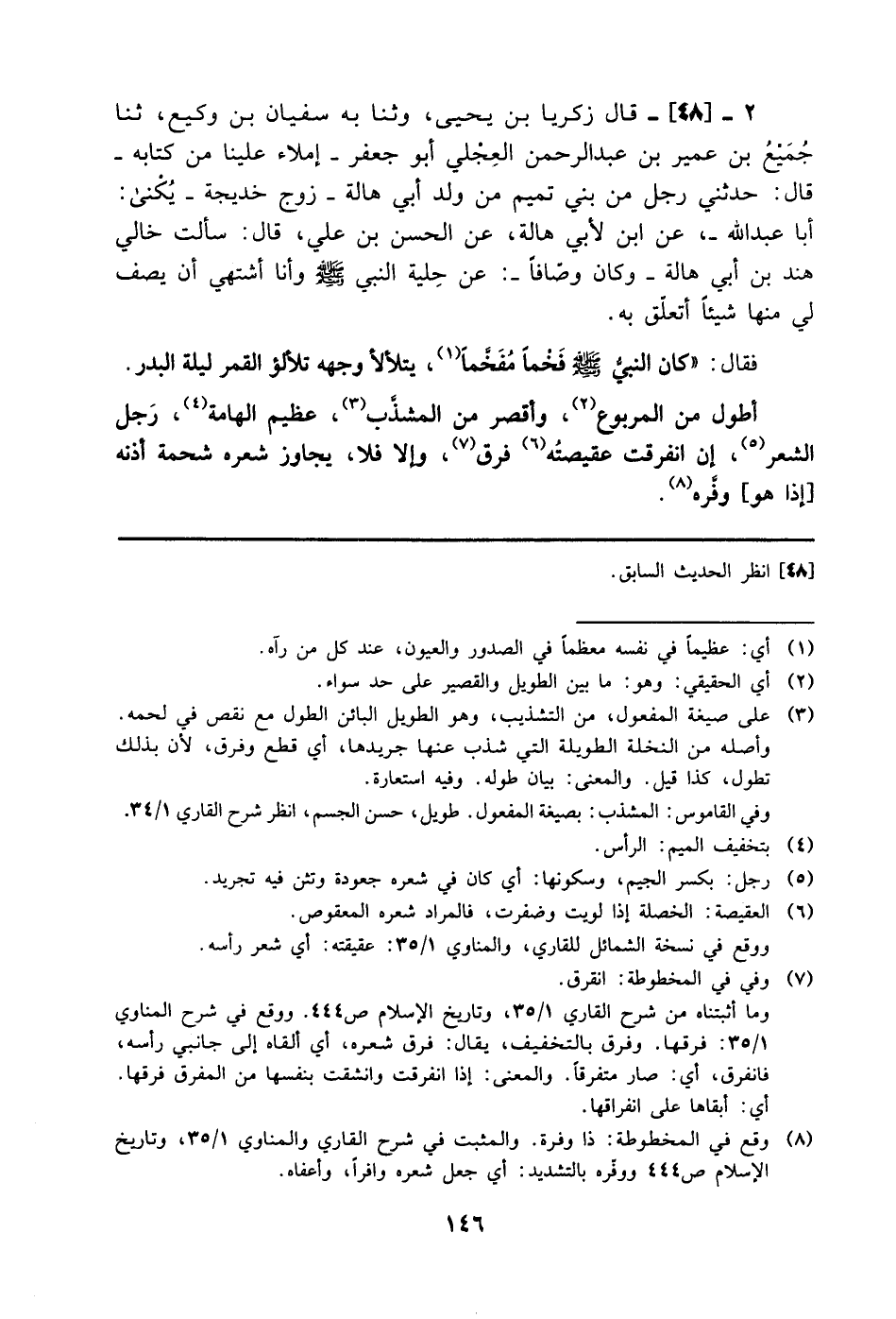 2 - (48) قَالَ زَكَرِيَّا بْنُ يَحْيَى: وَثنا بِهِ سُفْيَانُ بن وكيع، ثنا جميع بن عمر بن عبد الرحمن العجلي أبو جعفر، إملاء عَلَيْنَا مِنْ كِتَابِهِ قَالَ: حَدَّثَنِي رَجُلٌ مِنْ بَنِي تَمِيمٍ مِنْ وَلَدِ أَبِي هَالَةَ زَوْجِ خَدِيجَةَ يُكَنَّى أَبَا عَبْدِ اللَّهِ، عَنِ ابْنٍ لأَبِي هَالَةَ، عَنِ الْحَسَنِ بْنِ عَلِيٍّ قَالَ: سَأَلْتُ خَالِي هِنْدَ بْنَ أَبِي هَالَةَ -وَكَانَ وَصَّافًا - عَنْ حِلْيَةِ النَّبِيِّ صَلَّى اللَّهُ عَلَيْهِ وَسَلَّمَ وَأَنَا أَشْتَهِي أَنْ يَصِفَ لِي مِنْهَا شَيْئًا أَتَعَلَّقُ بِهِ.