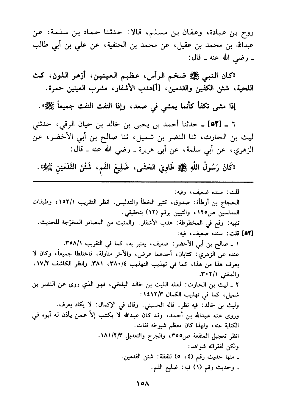 6 - (52) حَدَّثَنَا أَحْمَدُ بْنُ يَحْيَى بْنِ خَالِدِ بْنِ حيان الرقي: حدثني ليث بن الحارث: حدثنا النضر بن شميل: حدثنا صَالِحُ بْنُ أَبِي الأَخْضَرِ، عَنِ الزُّهْرِيِّ، عَنْ أَبِي سَلَمَةَ، عَنْ أَبِي هريرةَ رَضِيَ اللهُ عَنْهُ قالَ: كانَ رسولُ اللهِ صَلَّى اللَّهُ عَلَيْهِ وَسَلَّمَ طاوِيَ الحَشى، ضَليعَ الفمِ، شثنَ القَدمينِ صَلَّى اللَّهُ عَلَيْهِ وَسَلَّمَ.