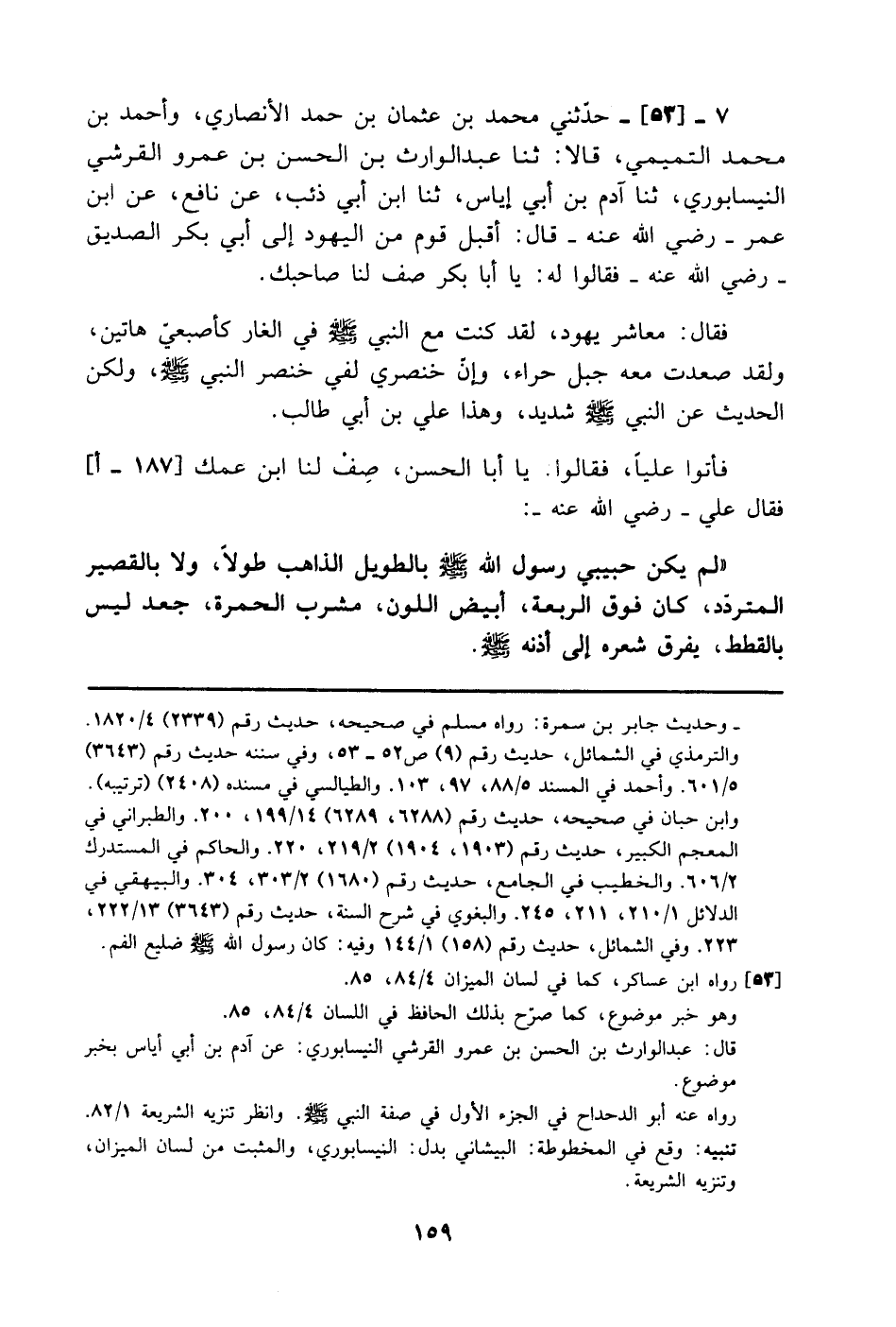 -[160]- وكانَ حَبيبي محمدٌ صَلَّى اللَّهُ عَلَيْهِ وَسَلَّمَ صَلْتَ الجَبينِ، واضحَ الخدَّينِ، أَدعجَ العينِ، دقيقَ المَسربةِ، برَّاقَ الثَّنايا، أَقنى الأنفِ، كأنَّ عنقَه إبريقُ فضةٍ، كأنَّ الذهبَ يَجري فِي تَراقيه.