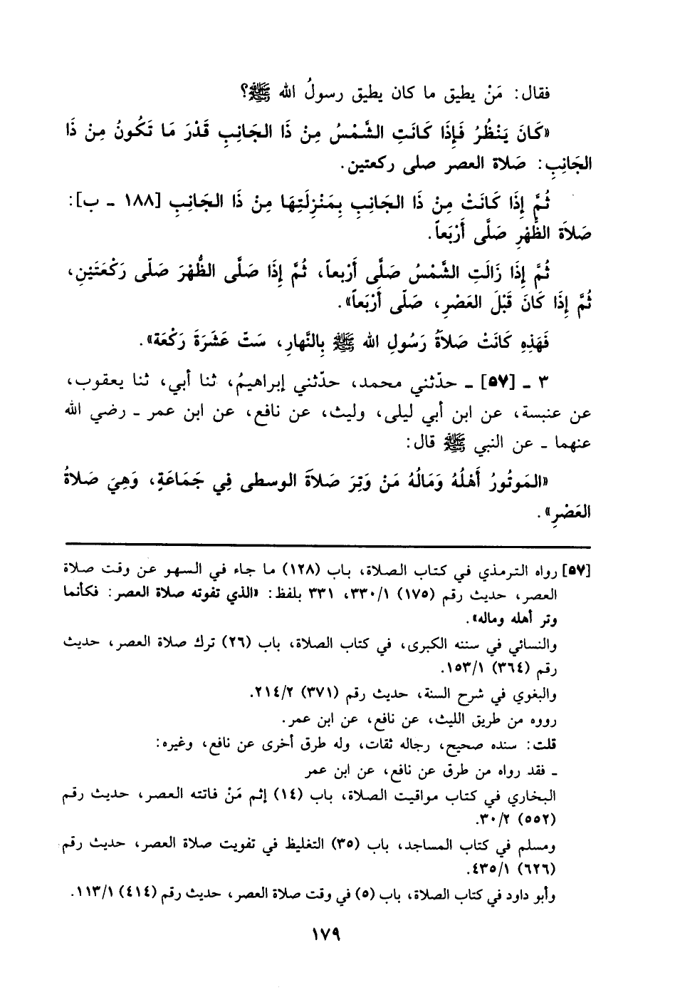 3 - (57) حَدَّثَني مُحَمَّد حَدَّثَنِي إبراهيم حَدَّثَنا أبي حَدَّثَنا يَعْقُوبُ عَنْ عَنْبَسَةَ عَنِ ابْنِ أَبِي لَيْلَى وَلَيْثٍ عَنْ نَافِعٍ عَنِ ابْنِ عُمَرَ رَضِيَ اللَّهُ عَنْهُمَا عَنِ النَّبِيِّ صَلَّى اللَّهُ عَلَيْهِ وَسَلَّمَ قَالَ: الْمَوْتُورُ أَهْلُهُ وَمَالُهُ مَنْ وُتِرَ صَلاةَ الْوُسْطَى فِي جَمَاعَةٍ وَهِيَ صَلاةُ الْعَصْرِ.