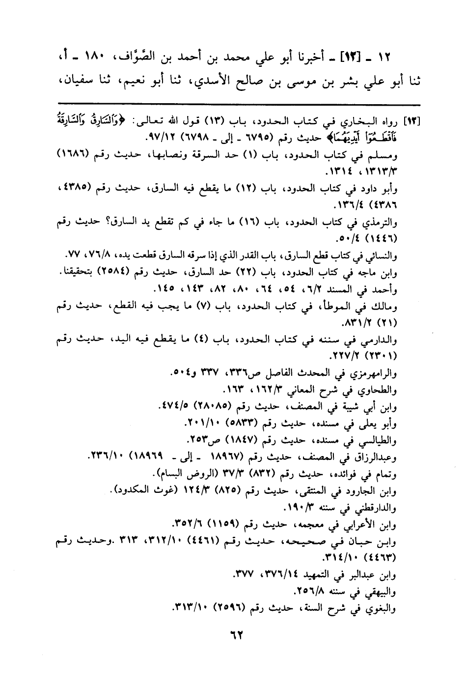 12 - أَخْبَرنَا أبو علي مُحَمَّد بن أحمد بن الصواف حَدَّثَنا أبو علي بشر بن موسى بن صالح الأسدي حَدَّثَنا أبو نعيم حَدَّثَنا سفيان -[63]- عن أيوب وإسماعيل بن أمية وعبيد الله وموسى بن عقبة عن نافع عن ابن عمر أن النبي صلى الله عليه وسلم قطع في مجن قيمته ثلاثة دراهم.