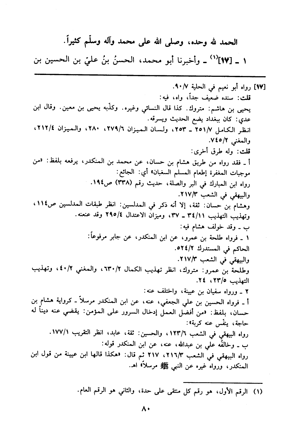 1 - (17) وأخبرنا أَبُو مُحَمَّدٍ الْحَسَن بْنُ عَلِيِّ بْنِ الْحُسَيْنِ بن -[81]- الحسن بن محمد الأسدي قراءة عليه قيل له أخبركم جدك أبو القاسم -[82]- الْحُسَيْن بن الْحَسَن أنبا أَبُو الْقَاسِمِ عَلِيُّ بْنُ مُحَمَّدِ بْنِ علي بن أبي العلاء -[83]- المصيصي قال قرأت على أبي بَكْر محمد بن عمر بن سليمان النصيبي المعروف بالعدني بها في الجامع سنة تسع عشرة وأربعمائة، قلت له: أخبركم أبو بكر أحمد بن يوسف بن خلاد النصيبي: ثنا الحارث يعني: ابن محمد بن أبي أسامة، حدثني يحيى بن هاشم السمسار، ثنا سفيان الثوري، عن محمد بن المنكدر، عن جابر بن عبد الله الأنصاري، قَالَ: قَالَ رَسُولُ اللَّهِ صَلَّى اللَّهُ عَلَيْهِ وسلم: إن من موجبات المغفرة: إدخالك السرور على أخيك المسلم: إشباع جوعته، وتنفيس كربته.