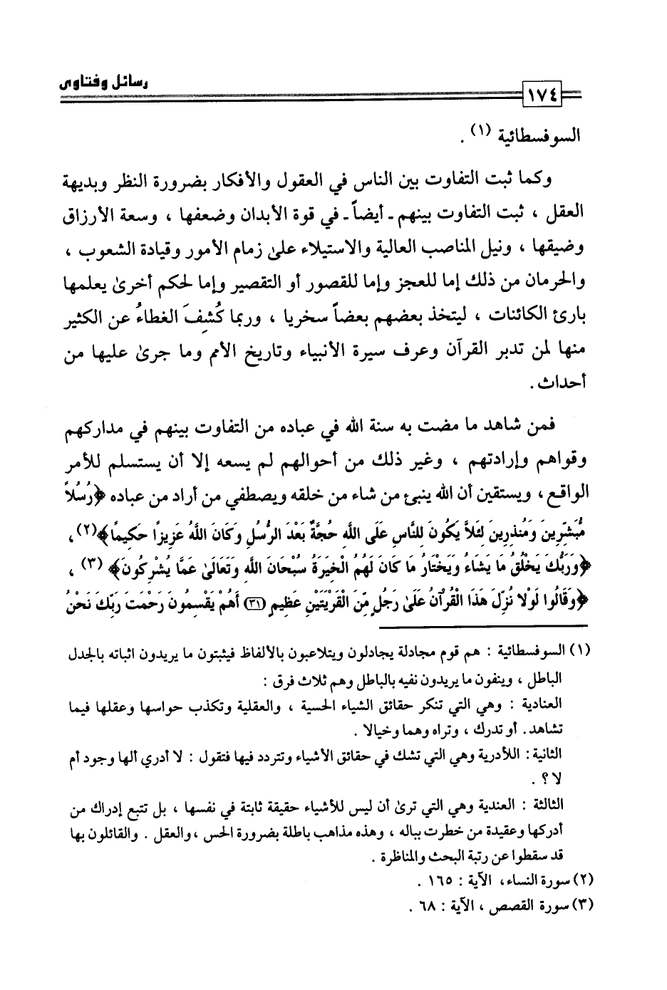 فمن شاهد ما مضت به سنة الله في عباده من التفاوت بينهم في مداركهم وقواهم وإرادتهم، وغير ذلك من أحوالهم لم يسعه إلا أن يستسلم للأمر الواقع، ويستيقن أن الله ينبئ من شاء من خلقه ويصطفي من أراد من عباده: {رُسُلًا مُبَشِّرِينَ وَمُنْذِرِينَ لِئَلَّا يَكُونَ لِلنَّاسِ عَلَى اللَّهِ حُجَّةٌ بَعْدَ الرُّسُلِ وَكَانَ اللَّهُ عَزِيزًا حَكِيمًا} ، {وَرَبُّكَ يَخْلُقُ مَا يَشَاءُ وَيَخْتَارُ مَا كَانَ لَهُمُ الْخِيَرَةُ سُبْحَانَ اللَّهِ وَتَعَالَى عَمَّا يُشْرِكُونَ} ، {وَقَالُوا لَوْلَا نُزِّلَ هَذَا الْقُرْآنُ عَلَى رَجُلٍ مِنَ الْقَرْيَتَيْنِ عَظِيمٍ أَهُمْ يَقْسِمُونَ رَحْمَةَ رَبِّكَ نَحْنُ قَسَمْنَا بَيْنَهُمْ مَعِيشَتَهُمْ فِي الْحَيَاةِ الدُّنْيَا وَرَفَعْنَا بَعْضَهُمْ فَوْقَ بَعْضٍ دَرَجَاتٍ لِيَتَّخِذَ بَعْضُهُمْ بَعْضًا سُخْرِيًّا وَرَحْمَةُ رَبِّكَ خَيْرٌ مِمَّا يَجْمَعُونَ} .