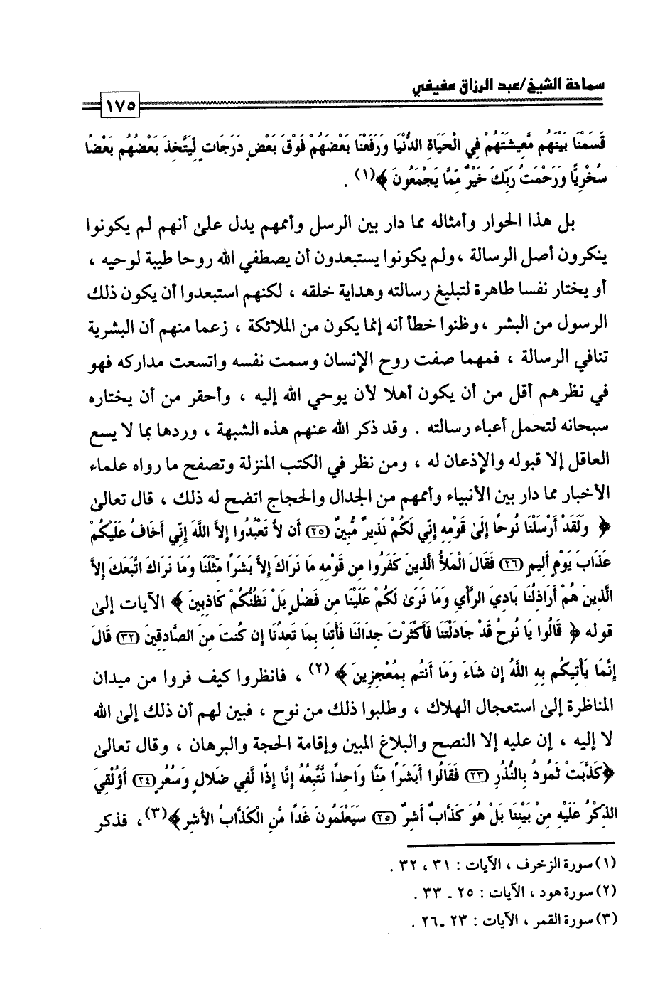 وقد ذكر الله عنهم هذه الشبهة، وردها بما لا يسع العاقل إلا قبوله والإذعان له، ومن نظر في الكتب المنزلة وتصفح ما رواه علماء الأخبار مما دار بين الأنبياء وأممهم من الجدال والحجاج اتضح له ذلك، قال تعالى: {وَلَقَدْ أَرْسَلْنَا نُوحًا إِلَى قَوْمِهِ إِنِّي لَكُمْ نَذِيرٌ مُبِينٌ أَنْ لَا تَعْبُدُوا إِلَّا اللَّهَ إِنِّي أَخَافُ عَلَيْكُمْ عَذَابَ يَوْمٍ أَلِيمٍ فَقَالَ الْمَلَأُ الَّذِينَ كَفَرُوا مِنْ قَوْمِهِ مَا نَرَاكَ إِلَّا بَشَرًا مِثْلَنَا وَمَا نَرَاكَ اتَّبَعَكَ إِلَّا الَّذِينَ هُمْ أَرَاذِلُنَا بَادِيَ الرَّأْيِ وَمَا نَرَى لَكُمْ عَلَيْنَا مِنْ فَضْلٍ بَلْ نَظُنُّكُمْ كَاذِبِينَ} الآيات إلى قوله: {قَالُوا يَانُوحُ قَدْ جَادَلْتَنَا فَأَكْثَرْتَ جِدَالَنَا فَأْتِنَا بِمَا تَعِدُنَا إِنْ كُنْتَ مِنَ الصَّادِقِينَ قَالَ إِنَّمَا يَأْتِيكُمْ بِهِ اللَّهُ إِنْ شَاءَ وَمَا أَنْتُمْ بِمُعْجِزِينَ} فانظروا كيف فروا من ميدان المناظرة إلى استعجال الهلاك، وطلبوا ذلك من نوح، فبين لهم أن ذلك إلى الله لا إليه، إن عليه إلا النصح والبلاغ المبين وإقامة الحجة والبرهان، وقال تعالى: {كَذَّبَتْ ثَمُودُ بِالنُّذُرِ فَقَالُوا أَبَشَرًا مِنَّا وَاحِدًا نَتَّبِعُهُ إِنَّا إِذًا لَفِي ضَلَالٍ وَسُعُرٍ أَؤُلْقِيَ الذِّكْرُ عَلَيْهِ مِنْ بَيْنِنَا بَلْ هُوَ كَذَّابٌ أَشِرٌ سَيَعْلَمُونَ غَدًا مَنِ الْكَذَّابُ الْأَشِرُ} ، فذكر