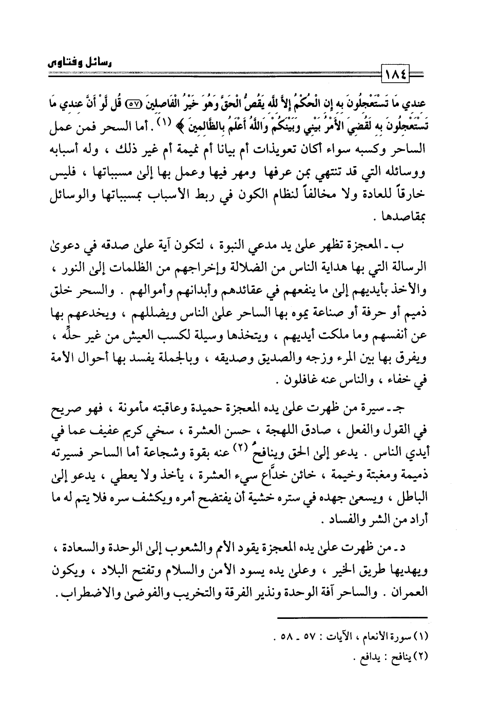 {مَا عِنْدِي مَا تَسْتَعْجِلُونَ بِهِ إِنِ الْحُكْمُ إِلَّا لِلَّهِ يَقُصُّ الْحَقَّ وَهُوَ خَيْرُ الْفَاصِلِينَ قُلْ لَوْ أَنَّ عِنْدِي مَا تَسْتَعْجِلُونَ بِهِ لَقُضِيَ الْأَمْرُ بَيْنِي وَبَيْنَكُمْ وَاللَّهُ أَعْلَمُ بِالظَّالِمِينَ} . أما السحر فمن عمل الساحر وكسبه سواء أكان تعويذات أم بيانا أم نميمة أم غير ذلك، وله أسبابه ووسائله التي قد تنتهي بمن عرفها ومهر فيها وعمل بها إلى مسبباتها، فليس خارقا للعادة ولا مخالفا لنظام الكون في ربط الأسباب بمسبباتها والوسائل بمقاصدها.