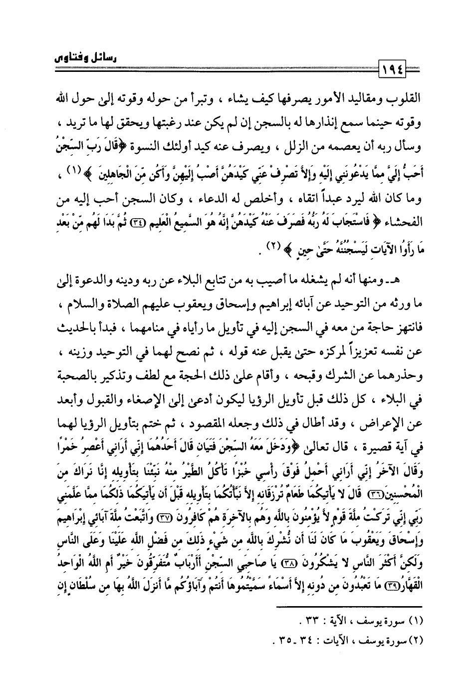هـ- ومنها أنه لم يشغله ما أصيب به من تتابع البلاء عن ربه ودينه والدعوة إلى ما ورثه من التوحيد عن آبائه إبراهيم وإسحاق ويعقوب عليهم الصلاة والسلام، فانتهز حاجة من معه في السجن إليه في تأويل ما رأياه في منامهما، فبدأ بالحديث عن نفسه تعزيزا لمركزه حتى يقبل عنه قوله، ثم نصح لهما في التوحيد وزينه، وحذرهما عن الشرك وقبحه، وأقام على ذلك الحجة مع لطف وتذكير بالصحبة في البلاء، كل ذلك قبل تأويل الرؤيا ليكون أدعى إلى الإصغاء والقبول وأبعد عن الإعراض، وقد أطال في ذلك وجعله المقصود، ثم ختم بتأويل الرؤيا لهما في آية قصيرة، قال تعالى: {وَدَخَلَ مَعَهُ السِّجْنَ فَتَيَانِ قَالَ أَحَدُهُمَا إِنِّي أَرَانِي أَعْصِرُ خَمْرًا وَقَالَ الْآخَرُ إِنِّي أَرَانِي أَحْمِلُ فَوْقَ رَأْسِي خُبْزًا تَأْكُلُ الطَّيْرُ مِنْهُ نَبِّئْنَا بِتَأْوِيلِهِ إِنَّا نَرَاكَ مِنَ الْمُحْسِنِينَ قَالَ لَا يَأْتِيكُمَا طَعَامٌ تُرْزَقَانِهِ إِلَّا نَبَّأْتُكُمَا بِتَأْوِيلِهِ قَبْلَ أَنْ يَأْتِيَكُمَا ذَلِكُمَا مِمَّا عَلَّمَنِي رَبِّي إِنِّي تَرَكْتُ مِلَّةَ قَوْمٍ لَا يُؤْمِنُونَ بِاللَّهِ وَهُمْ بِالْآخِرَةِ هُمْ كَافِرُونَ وَاتَّبَعْتُ مِلَّةَ آبَائِي إِبْرَاهِيمَ وَإِسْحَاقَ وَيَعْقُوبَ مَا كَانَ لَنَا أَنْ نُشْرِكَ بِاللَّهِ مِنْ شَيْءٍ ذَلِكَ مِنْ فَضْلِ اللَّهِ عَلَيْنَا وَعَلَى النَّاسِ وَلَكِنَّ أَكْثَرَ النَّاسِ لَا يَشْكُرُونَ يَاصَاحِبَيِ السِّجْنِ أَأَرْبَابٌ مُتَفَرِّقُونَ خَيْرٌ أَمِ اللَّهُ الْوَاحِدُ الْقَهَّارُ مَا تَعْبُدُونَ مِنْ دُونِهِ إِلَّا أَسْمَاءً سَمَّيْتُمُوهَا أَنْتُمْ وَآبَاؤُكُمْ مَا أَنْزَلَ اللَّهُ بِهَا مِنْ سُلْطَانٍ إِنِ الْحُكْمُ إِلَّا لِلَّهِ أَمَرَ أَلَّا تَعْبُدُوا إِلَّا إِيَّاهُ ذَلِكَ الدِّينُ الْقَيِّمُ وَلَكِنَّ أَكْثَرَ النَّاسِ لَا يَعْلَمُونَ يَاصَاحِبَيِ السِّجْنِ أَمَّا أَحَدُكُمَا فَيَسْقِي رَبَّهُ خَمْرًا وَأَمَّا الْآخَرُ فَيُصْلَبُ فَتَأْكُلُ الطَّيْرُ مِنْ رَأْسِهِ قُضِيَ الْأَمْرُ الَّذِي فِيهِ تَسْتَفْتِيَانِ}