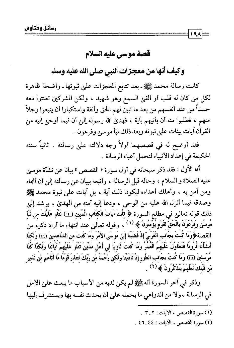 أما الأول: فقد ذكر سبحانه في أول سورة "القصص" بيانا عن نشأة موسى عليه الصلاة والسلام، وحاله قبل الرسالة، وأتبعه ببيان عن رسالته إلى أن أنجاه ومن آمن به، وأهلك أعداءه ليكون ذلك آية، بل آيات على نبوة محمد صلى الله عليه وسلم وصدقه فيما أنزل الله عليه من الوحي، ودعا إليه أمته من الهدى، ويرشد إلى ذلك قوله تعالى في مطلع السورة: {تِلْكَ آيَاتُ الْكِتَابِ الْمُبِينِ نَتْلُوا عَلَيْكَ مِنْ نَبَإِ مُوسَى وَفِرْعَوْنَ بِالْحَقِّ لِقَوْمٍ يُؤْمِنُونَ} ، وقوله تعالى عند انتهاء ما أراد ذكره من القصة: {وَمَا كُنْتَ بِجَانِبِ الْغَرْبِيِّ إِذْ قَضَيْنَا إِلَى مُوسَى الْأَمْرَ وَمَا كُنْتَ مِنَ الشَّاهِدِينَ وَلَكِنَّا أَنْشَأْنَا قُرُونًا فَتَطَاوَلَ عَلَيْهِمُ الْعُمُرُ وَمَا كُنْتَ ثَاوِيًا فِي أَهْلِ مَدْيَنَ تَتْلُو عَلَيْهِمْ آيَاتِنَا وَلَكِنَّا كُنَّا مُرْسِلِينَ وَمَا كُنْتَ بِجَانِبِ الطُّورِ إِذْ نَادَيْنَا وَلَكِنْ رَحْمَةً مِنْ رَبِّكَ لِتُنْذِرَ قَوْمًا مَا أَتَاهُمْ مِنْ نَذِيرٍ مِنْ قَبْلِكَ لَعَلَّهُمْ يَتَذَكَّرُونَ} .
