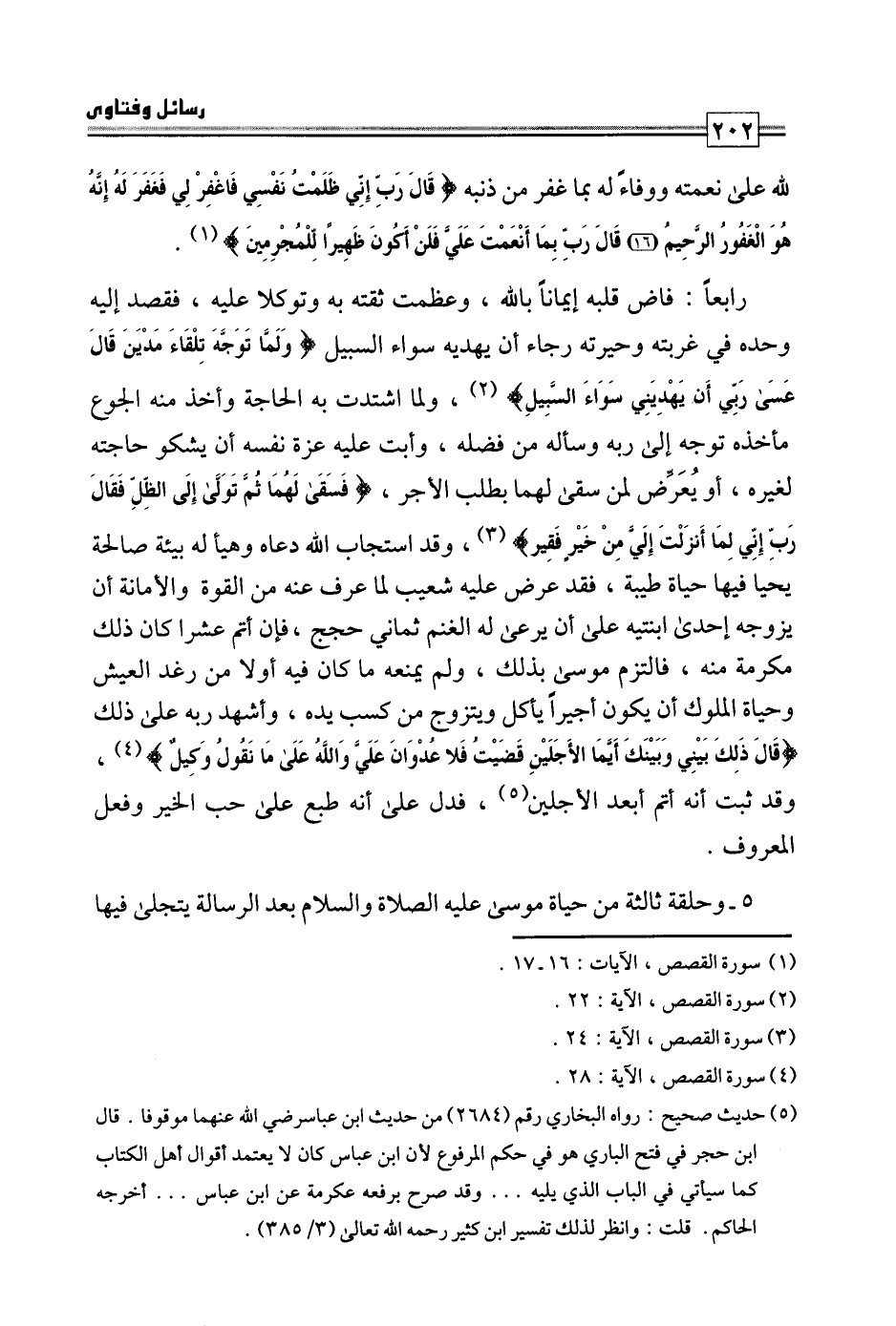 رابعا: فاض قلبه إيمانا بالله، وعظمت ثقته به وتوكلا عليه، فقصد إليه وحده في غربته وحيرته رجاء أن يهديه سواء السبيل {وَلَمَّا تَوَجَّهَ تِلْقَاءَ مَدْيَنَ قَالَ عَسَى رَبِّي أَنْ يَهْدِيَنِي سَوَاءَ السَّبِيلِ} ، ولما اشتدت به الحاجة وأخذ منه الجوع مأخذه توجه إلى ربه وسأله من فضله، وأبت عليه عزة نفسه أن يشكو حاجته لغيره، أو يعرض لمن سقى لهما بطلب الأجر، {فَسَقَى لَهُمَا ثُمَّ تَوَلَّى إِلَى الظِّلِّ فَقَالَ رَبِّ إِنِّي لِمَا أَنْزَلْتَ إِلَيَّ مِنْ خَيْرٍ فَقِيرٌ} وقد استجاب الله دعاه وهيأ له بيئة صالحة يحيا فيها حياة طيبة فقد عرض عليه شعيب لما عرف عنه من القوة والأمانة أن يزوجه إحدى ابنتيه على أن يرعى له الغنم ثماني حجج، فإن أتم عشرا كان ذلك مكرمة منه، فالتزم موسى بذلك، ولم يمنعه ما كان فيه أولا من رغد العيش وحياة الملوك أن يكون أجيرا يأكل ويتزوج من كسب يده، وأشهد ربه على ذلك {قَالَ ذَلِكَ بَيْنِي وَبَيْنَكَ أَيَّمَا الْأَجَلَيْنِ قَضَيْتُ فَلَا عُدْوَانَ عَلَيَّ وَاللَّهُ عَلَى مَا نَقُولُ وَكِيلٌ} وقد ثبت أنه أتم أبعد الأجلين، فدل على أنه طبع على حب الخير وفعل المعروف.