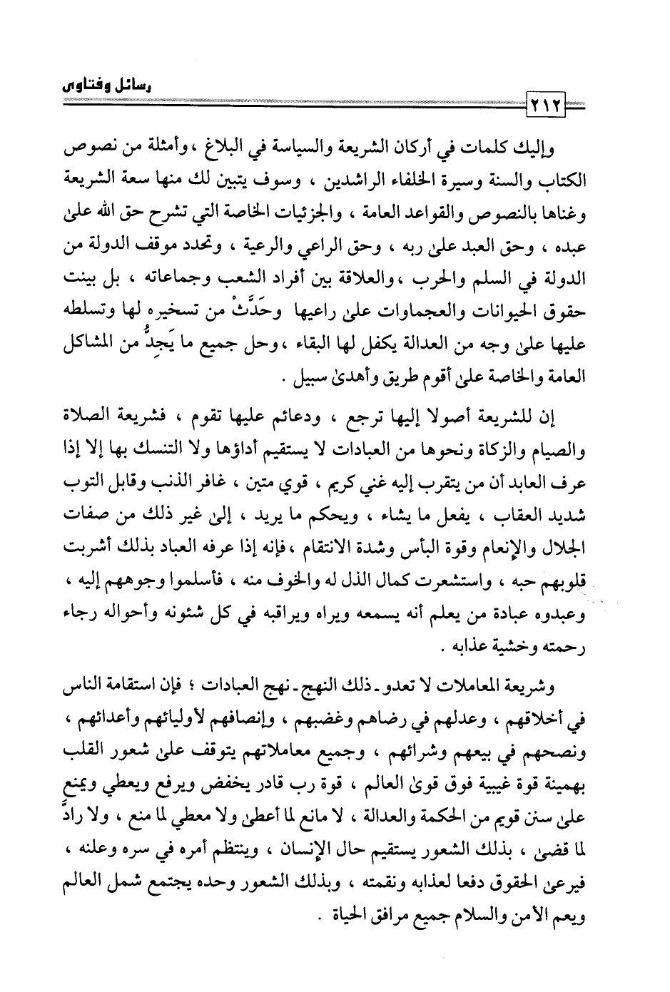 وإليك كلمات في أركان الشريعة والسياسة في البلاغ، وأمثلة من نصوص الكتاب والسنة وسيرة الخلفاء الراشدين، وسوف يتبين لك منها سعة الشريعة وغناها بالنصوص والقواعد العامة، والجزئيات الخاصة التي تشرح حق الله على عبده، وحق العبد على ربه، وحق الراعي والرعية، وتحدد موقف الدولة من الدولة في السلم والحرب، والعلاقة بين أفراد الشعب وجماعاته، بل بينت حقوق الحيوانات والعجماوات على راعيها وحدث من تسخيره لها وتسلطه عليها على وجه من العدالة يكفل لها البقاء، وحل جميع ما يجد من المشاكل العامة والخاصة على أقوم وأهدى سبيل.