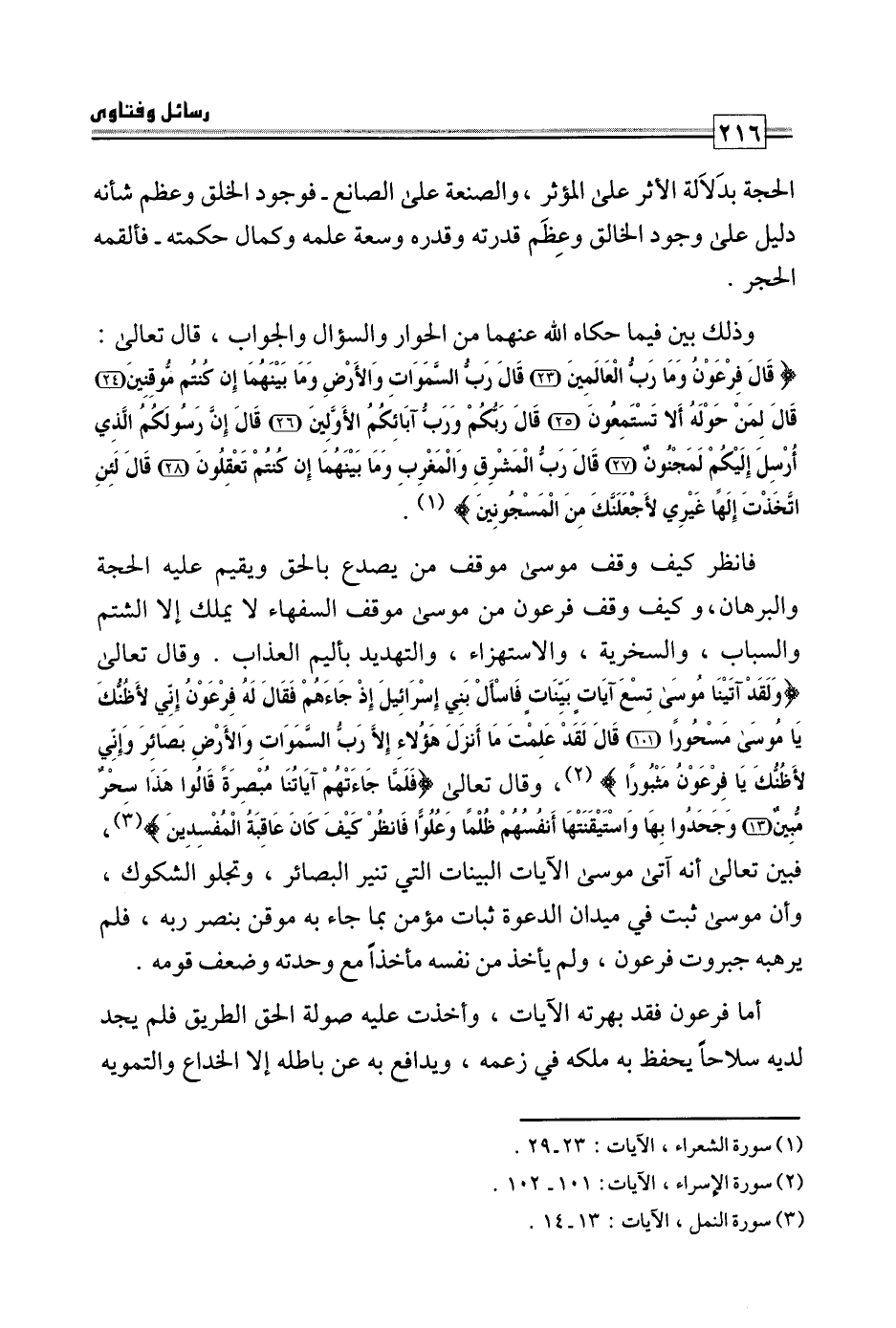 فانظر كيف وقف موسى موقف من يصدع بالحق ويقيم عليه الحجة والبرهان، وكيف وقف فرعون من موسى موقف السفهاء لا يملك إلا الشتم والسباب، والسخرية، والاستهزاء، والتهديد بأليم العذاب، وقال تعالى: {وَلَقَدْ آتَيْنَا مُوسَى تِسْعَ آيَاتٍ بَيِّنَاتٍ فَاسْأَلْ بَنِي إِسْرَائِيلَ إِذْ جَاءَهُمْ فَقَالَ لَهُ فِرْعَوْنُ إِنِّي لَأَظُنُّكَ يَامُوسَى مَسْحُورًا قَالَ لَقَدْ عَلِمْتَ مَا أَنْزَلَ هَؤُلَاءِ إِلَّا رَبُّ السَّمَاوَاتِ وَالْأَرْضِ بَصَائِرَ وَإِنِّي لَأَظُنُّكَ يَافِرْعَوْنُ مَثْبُورًا} ، وقال تعالى: {فَلَمَّا جَاءَتْهُمْ آيَاتُنَا مُبْصِرَةً قَالُوا هَذَا سِحْرٌ مُبِينٌ وَجَحَدُوا بِهَا وَاسْتَيْقَنَتْهَا أَنْفُسُهُمْ ظُلْمًا وَعُلُوًّا فَانْظُرْ كَيْفَ كَانَ عَاقِبَةُ الْمُفْسِدِينَ} فبين تعالى أنه آتى موسى الآيات البينات التي تنير البصائر، وتجلو الشكوك، وأن موسى ثبت في ميدان الدعوة ثبات مؤمن بما جاء به موقن بنصر ربه، فلم يرهبه جبروت فرعون ولم يأخذ من نفسه مأخذا مع وحدته وضعف قومه.