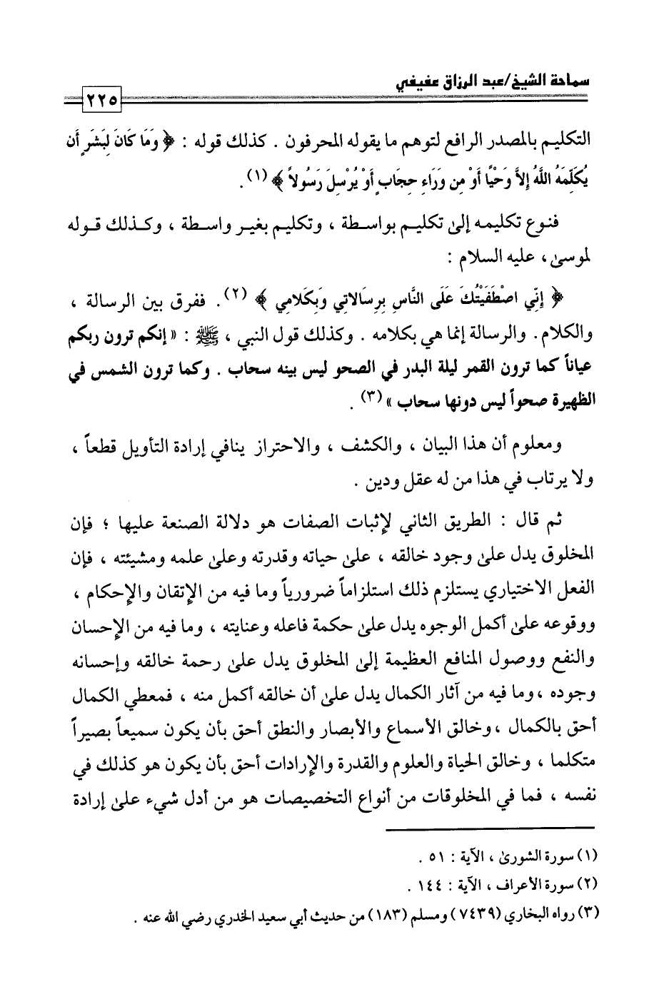فنوع تكليمه إلى تكليم بواسطة، وتكليم بغير واسطة، وكذلك قوله لموسى عليه السلام: {إِنِّي اصْطَفَيْتُكَ عَلَى النَّاسِ بِرِسَالَاتِي وَبِكَلَامِي} ففرق بين الرسالة والكلام، والرسالة إنما هي بكلامه، وكذلك قول النبي صلى الله عليه وسلم: «إنكم ترون ربكم عيانا كما ترون القمر ليلة البدر في الصحو ليس بينه سحاب، وكما ترون الشمس في الظهيرة صحوا ليس دونها سحاب» .