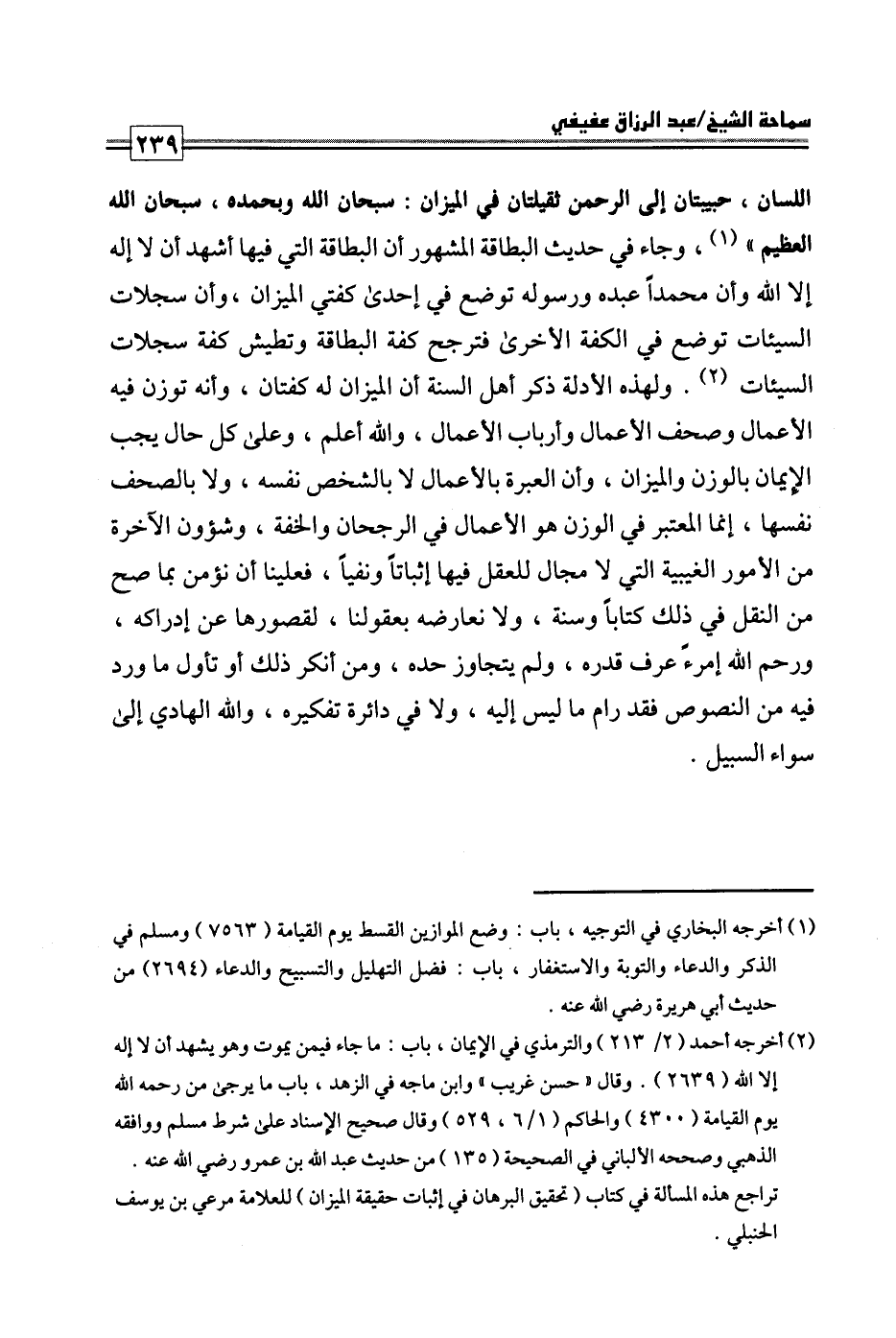 كتاب فتاوى ورسائل سماحة الشيخ عبد الرزاق عفيفي - قسم العقيدة