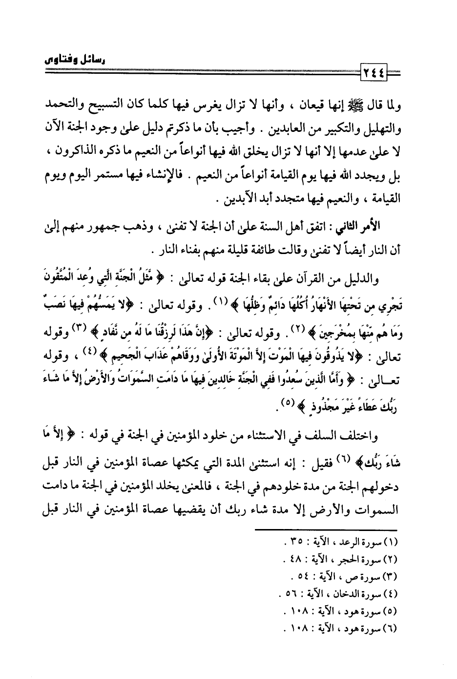 الأمر الثاني: اتفق أهل السنة على أن الجنة لا تفنى، وذهب جمهور منهم إلى أن النار أيضا لا تفنى وقالت طائفة قليلة منهم بفناء النار.
