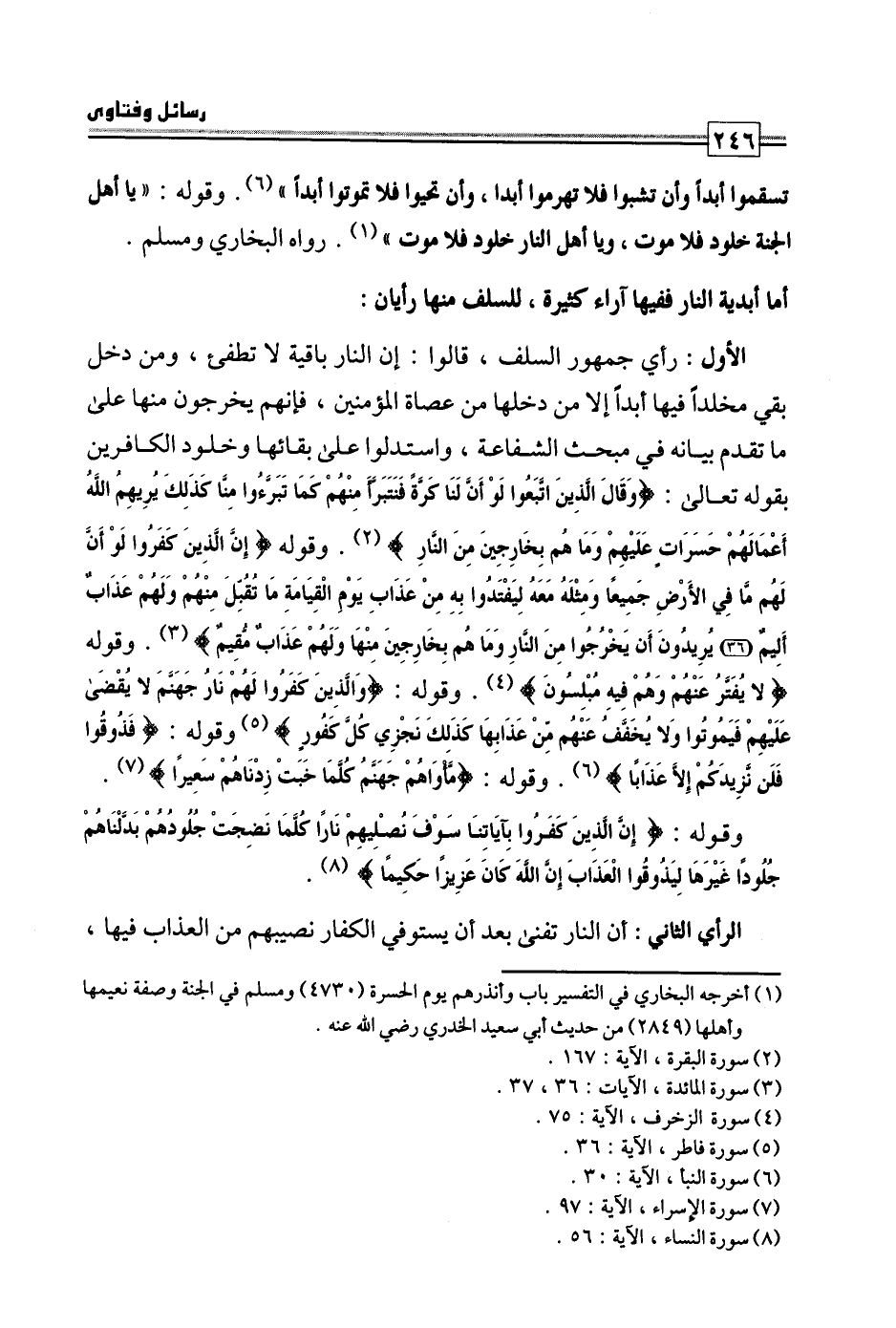 الأول: رأي جمهور السلف، قالوا: إن النار باقية لا تطفأ، ومن دخل بقي مخلدا فيها أبدا إلا من دخلها من عصاة المؤمنين، فإنهم يخرجون منها على ما تقدم بيانه في مبحث الشفاعة، واستدلوا على بقائها وخلود الكافرين بقوله تعالى: {وَقَالَ الَّذِينَ اتَّبَعُوا لَوْ أَنَّ لَنَا كَرَّةً فَنَتَبَرَّأَ مِنْهُمْ كَمَا تَبَرَّءُوا مِنَّا كَذَلِكَ يُرِيهِمُ اللَّهُ أَعْمَالَهُمْ حَسَرَاتٍ عَلَيْهِمْ وَمَا هُمْ بِخَارِجِينَ مِنَ النَّارِ} وقوله: {إِنَّ الَّذِينَ كَفَرُوا لَوْ أَنَّ لَهُمْ مَا فِي الْأَرْضِ جَمِيعًا وَمِثْلَهُ مَعَهُ لِيَفْتَدُوا بِهِ مِنْ عَذَابِ يَوْمِ الْقِيَامَةِ مَا تُقُبِّلَ مِنْهُمْ وَلَهُمْ عَذَابٌ أَلِيمٌ يُرِيدُونَ أَنْ يَخْرُجُوا مِنَ النَّارِ وَمَا هُمْ بِخَارِجِينَ مِنْهَا وَلَهُمْ عَذَابٌ مُقِيمٌ} وقوله: {لَا يُفَتَّرُ عَنْهُمْ وَهُمْ فِيهِ مُبْلِسُونَ} ، وقوله: {وَالَّذِينَ كَفَرُوا لَهُمْ نَارُ جَهَنَّمَ لَا يُقْضَى عَلَيْهِمْ فَيَمُوتُوا وَلَا يُخَفَّفُ عَنْهُمْ مِنْ عَذَابِهَا كَذَلِكَ نَجْزِي كُلَّ كَفُورٍ} وقوله: {فَذُوقُوا فَلَنْ نَزِيدَكُمْ إِلَّا عَذَابًا} وقوله: {مَأْوَاهُمْ جَهَنَّمُ كُلَّمَا خَبَتْ زِدْنَاهُمْ سَعِيرًا} .