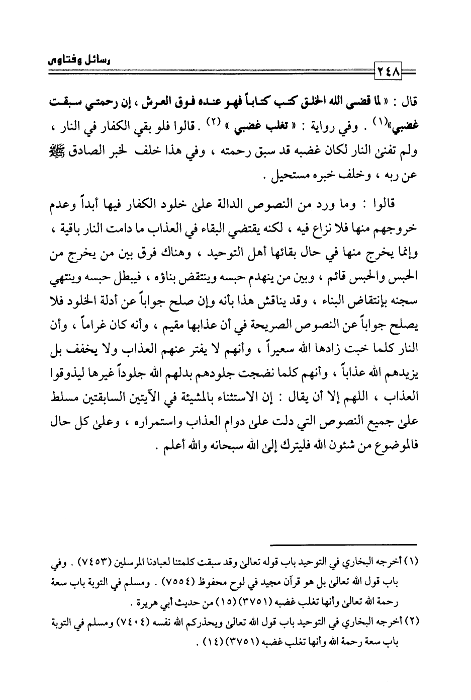 قال: «لما قضى الله الخلق كتب كتابا فهو عنده فوق العرش، إن رحمتي سبقت غضبي» وفي رواية: «تغلب غضبي» . قالوا: فلو بقي الكفار في النار، ولم تفن النار لكان غضبه قد سبق رحمته، وفي هذا خلف لخبر الصادق صلى الله عليه وسلم عن ربه، وخلف خبره مستحيل.