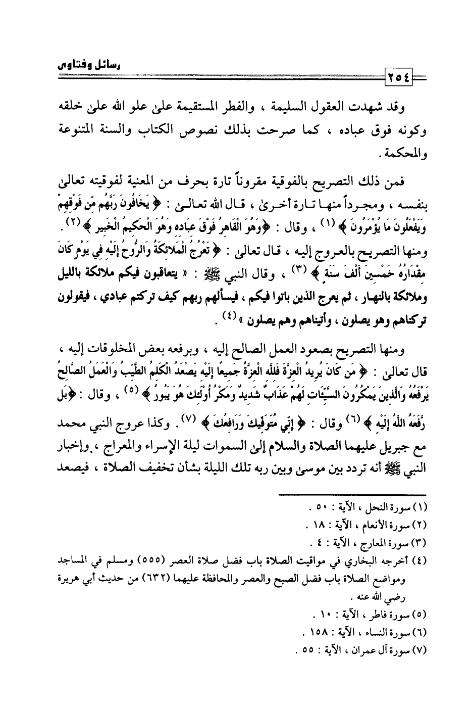 ومنها التصريح بصعود العمل الصالح إليه، وبرفعه بعض المخلوقات إليه، قال تعالى: {مَنْ كَانَ يُرِيدُ الْعِزَّةَ فَلِلَّهِ الْعِزَّةُ جَمِيعًا إِلَيْهِ يَصْعَدُ الْكَلِمُ الطَّيِّبُ وَالْعَمَلُ الصَّالِحُ يَرْفَعُهُ وَالَّذِينَ يَمْكُرُونَ السَّيِّئَاتِ لَهُمْ عَذَابٌ شَدِيدٌ وَمَكْرُ أُولَئِكَ هُوَ يَبُورُ} ، وقال: {بَلْ رَفَعَهُ اللَّهُ إِلَيْهِ} وقال: {إِنِّي مُتَوَفِّيكَ وَرَافِعُكَ} وكذا عروج النبي محمد مع جبريل عليهما الصلاة والسلام إلى السماوات ليلة الإسراء والمعراج، وإخبار النبي صلى الله عليه وسلم أنه تردد بين موسى وبين ربه تلك الليلة بشأن تخفيف الصلاة، فيصعد