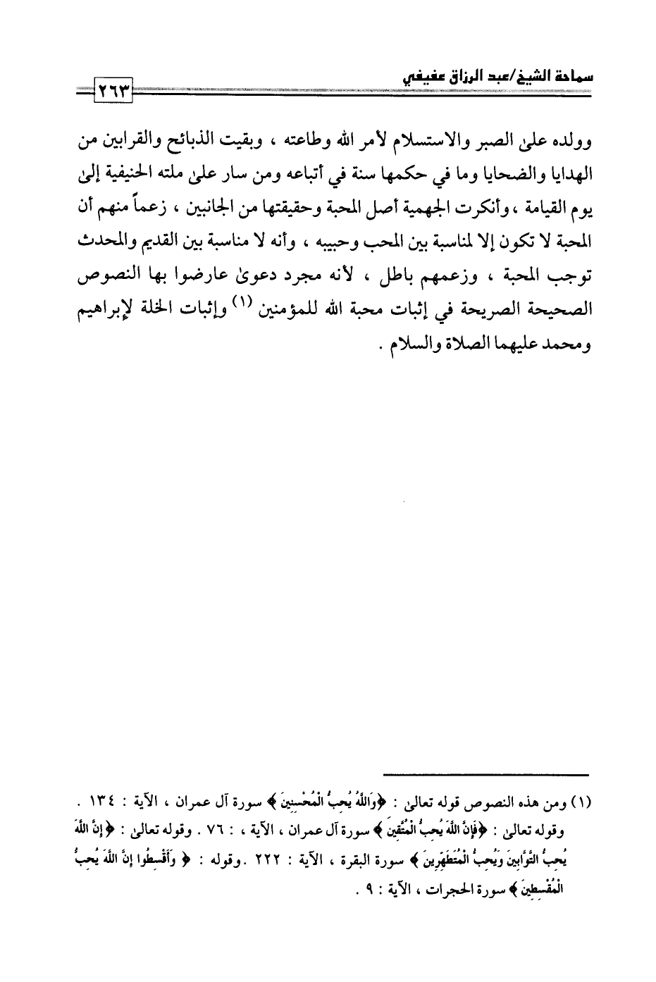 وولده على الصبر والاستسلام لأمر الله وطاعته، وبقيت الذبائح والقرابين من الهدايا والضحايا وما في حكمها سنة في أتباعه ومن سار على ملته الحنيفية إلى يوم القيامة، وأنكرت الجهمية أصل المحبة وحقيقتها من الجانبين، زعما منهم أن المحبة لا تكون إلا لمناسبة بين المحب وحبيبه، وأنه لا مناسبة بين القديم والمحدث توجب المحبة، وزعمهم باطل؛ لأنه مجرد دعوى عارضوا بها النصوص الصحيحة الصريحة في إثبات محبة الله للمؤمنين وإثبات الخلة لإبراهيم ومحمد عليهما الصلاة والسلام.