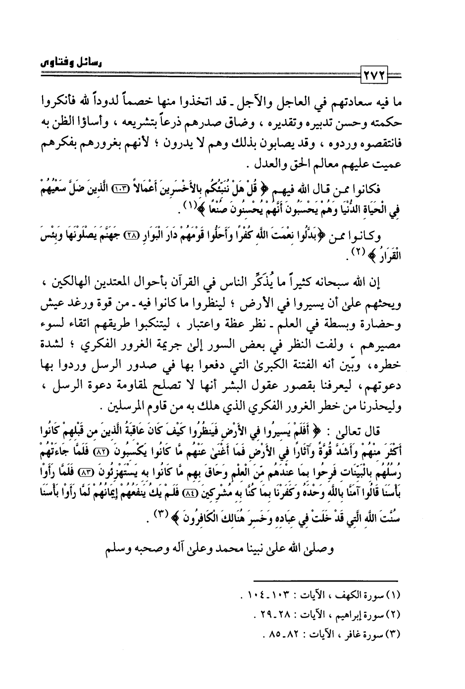 إن الله سبحانه كثيرا ما يذكر الناس في القرآن بأحوال المعتدين والهالكين، ويحثهم على أن يسيروا في الأرض؛ لينظروا ما كانوا فيه -من قوة ورغد عيش وحضارة وبسطة في العلم- نظر عظة واعتبار، ليتنكبوا طرقهم اتقاء لسوء مصيرهم، ولفت النظر في بعض السور إلى جريمة الغرور الفكري؛ لشدة خطره، وبين أنه الفتنة الكبرى التي دفعوا بها في صدور الرسل وردوا بها دعوتهم، ليعرفنا بقصور عقول البشر أنها لا تصلح لمقاومة دعوة الرسل، وليحذرنا من خطر الغرور الفكري الذي هلك به من قاوم المرسلين.