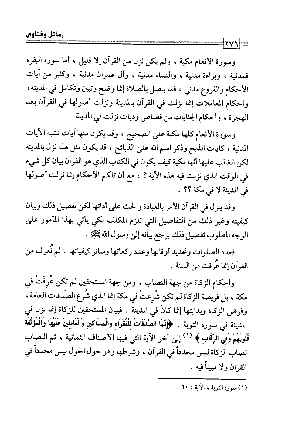 وسورة الأنعام مكية، ولم يكن نزل من القرآن إلا قليل، أما سورة البقرة فمدنية، وبراءة مدنية، والنساء مدنية، وآل عمران مدنية، وكثير من آيات الأحكام والفروع مدني، فما يتصل بالصلاة إنما وضح وتبين وتكامل في المدينة، وأحكام المعاملات إنما نزلت في القرآن بالمدينة ونزلت أصولها في القرآن بعد الهجرة، وأحكام الجنايات من قصاص وديات نزلت في المدينة.