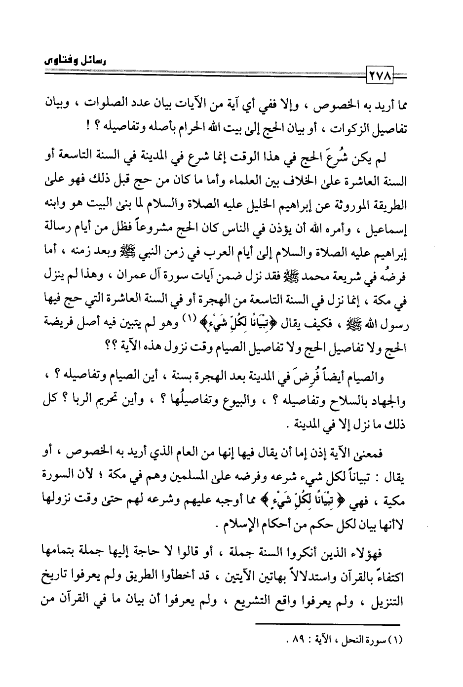 لم يكن شرع الحج في هذا الوقت إنما شرع في المدينة في السنة التاسعة أو السنة العاشرة على الخلاف بين العلماء وأما ما كان من حج قبل ذلك فهو على الطريقة الموروثة عن إبراهيم الخليل عليه الصلاة والسلام لما بنى البيت هو وابنه إسماعيل، وأمره الله أن يؤذن في الناس كان الحج مشروعا فظل من أيام رسالة إبراهيم عليه الصلاة والسلام إلى أيام العرب في زمن النبي صلى الله عليه وسلم وبعد زمنه، أما فرضه في شريعة محمد صلى الله عليه وسلم فقد نزل ضمن آيات سورة آل عمران، وهذا لم ينزل في مكة، إنما نزل في السنة التاسعة من الهجرة أو في السنة العاشرة التي حج فيها رسول الله صلى الله عليه وسلم، فكيف يقال: {تِبْيَانًا لِكُلِّ شَيْءٍ} وهو لم يتبين فيه أصل فريضة الحج ولا تفاصيل الحج ولا تفاصيل الصيام وقت نزول هذه الآية؟