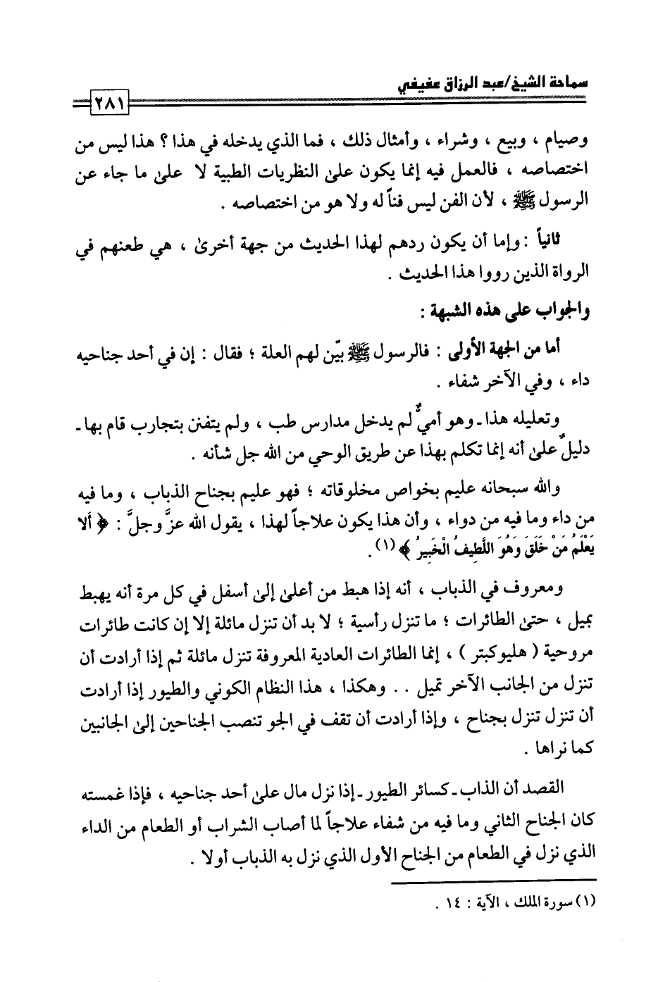 والله سبحانه عليم بخواص مخلوقاته؛ فهو عليم بجناح الذباب، وما فيه من داء وما فيه من دواء، وأن هذا يكون علاجا لهذا، يقول الله عز وجل: {أَلَا يَعْلَمُ مَنْ خَلَقَ وَهُوَ اللَّطِيفُ الْخَبِيرُ} .
