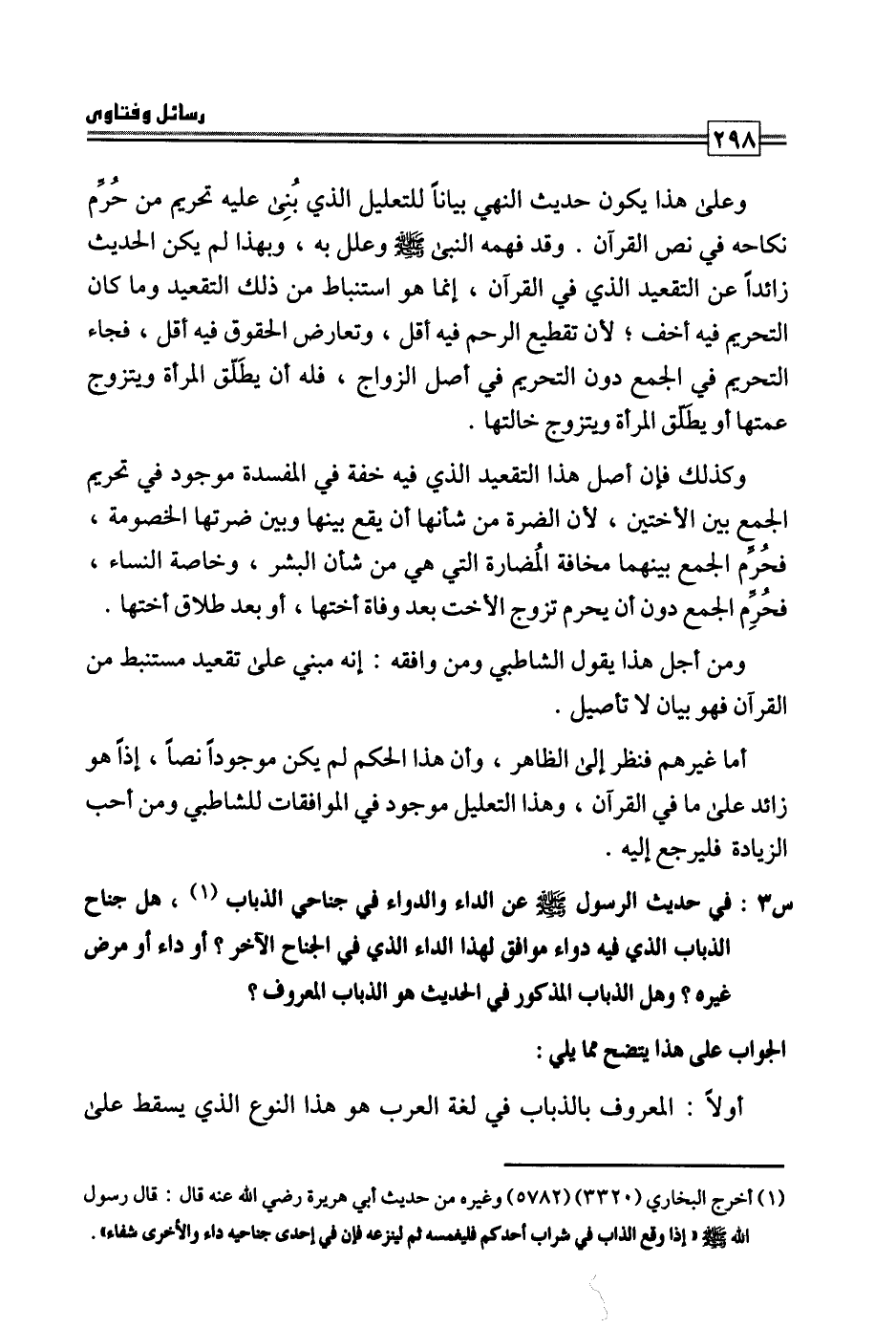 س3: في حديث الرسول صلى الله عليه وسلم عن الداء والدواء في جناحي الذباب، هل جناح الذباب الذي فيه دواء موافق لهذا الداء الذي في الجناح الآخر؟ أو داء أو مرض غيره؟ وهل الذباب المذكور في الحديث هو الذباب المعروف؟