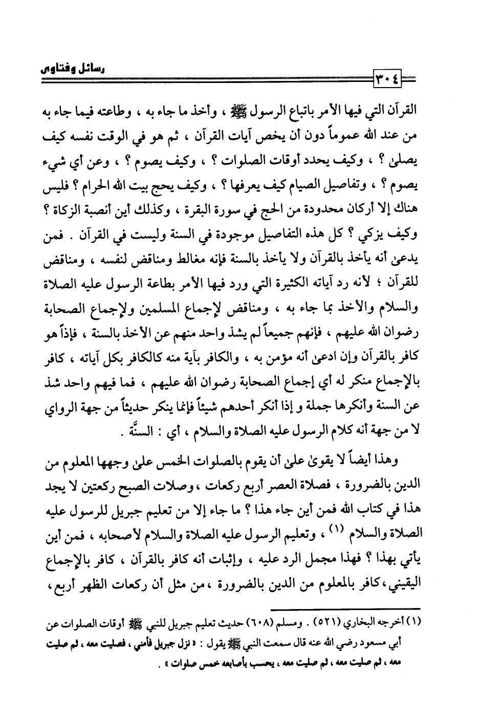 القرآن التي فيها الأمر باتباع الرسول صلى الله عليه وسلم، وأخذ ما جاء به، وطاعته فيما جاء به من عند الله عموما دون أن يخص آيات القرآن، ثم هو في الوقت نفسه كيف يصلي؟ ، وكيف يحدد أوقات الصلوات؟ ، وكيف يحج بيت الله الحرام؟ فليس هناك إلا أركان محدودة من الحج في سورة البقرة، وكذلك أين أنصبة الزكاة؟ وكيف يزكي؟ كل هذه التفاصيل موجودة في السنة وليست في القرآن، فمن يدعي أنه يأخذ بالقرآن ولا يأخذ بالسنة فإنه مغالط ومناقض لنفسه، ومناقض للقرآن؛ لأنه رد آياته الكثيرة التي ورد فيها الأمر بطاعة الرسول عليه الصلاة والسلام والأخذ بما جاء به، ومناقض لإجماع الصحابة رضوان الله عليهم، فإنهم جميعا لم يشذ واحد منهم عن الأخذ بالسنة، فإذا هو كافر بالقرآن وإن ادعى أنه مؤمن به، والكافر بآية منه كالكافر بكل آياته، كافر بالإجماع منكر له، أي: إجماع الصحابة رضوان الله عليهم، فما فيهم واحد شذ عن السنة وأنكرها جملة وإذا أنكر أحدهم شيئا فإنما ينكر حديثا من جهة الراوي لا من جهة أنه كلام الرسول عليه الصلاة والسلام، أي: السنة.