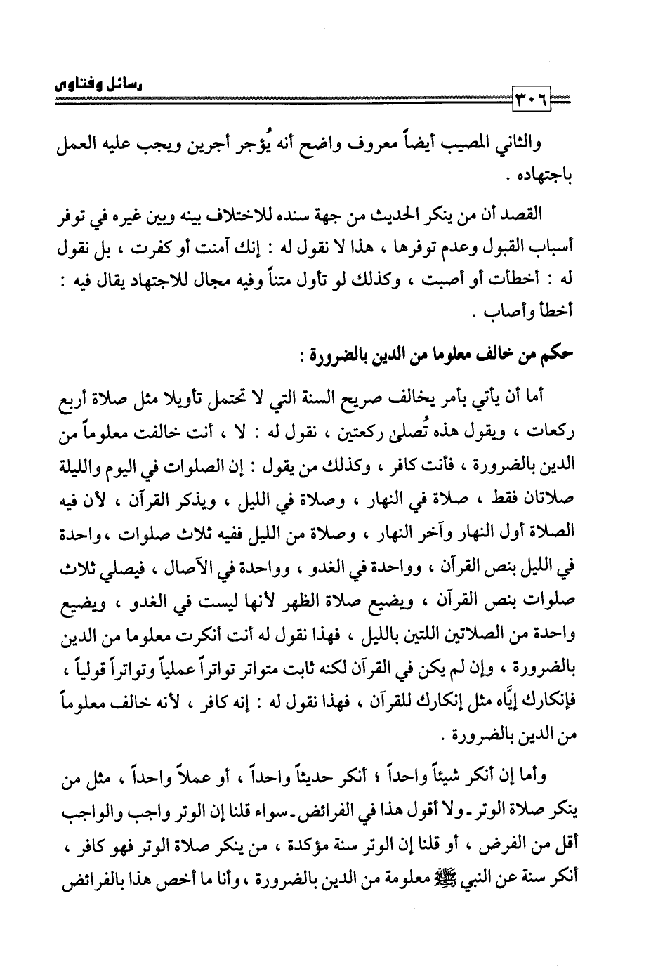 أما أن يأتي بأمر يخالف صريح السنة التي لا تحتمل تأويلا مثل صلاة أربع ركعات، يقول هذه تصلى ركعتين، نقول له: لا، أنت خالفت معلوما من الدين بالضرورة، فأنت كافر، وكذلك من يقول: إن الصلوات في اليوم والليلة صلاتان فقط، صلاة في النهار، وصلاة في الليل، ويذكر القرآن؛ لأن فيه الصلاة أول النهار وآخر النهار، وصلاة من الليل ففيه ثلاث صلوات، واحدة في الليل بنص القرآن، وواحدة في الغدو، وواحدة في الآصال، فيصلي ثلاث صلوات بنص القرآن، ويضيع صلاة الظهر لأنها ليست في الغدو، ويضيع واحدة من الصلاتين بالليل، فهذا نقول له أنت أنكرت معلوما من الدين بالضرورة، وإن لم يكن في القرآن لكنه ثابت متواتر تواترا عمليا وتواترا قوليا، فإنكارك إياه مثل إنكارك للقرآن، فهذا نقول له: إنه كافر؛ لأنه خالف معلوما من الدين بالضرورة.