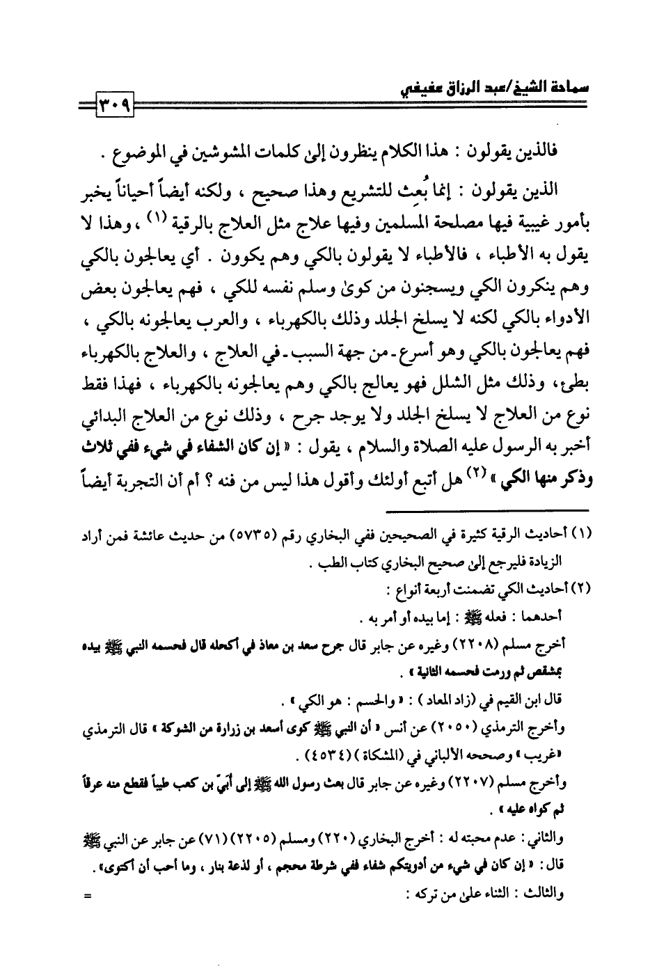 الذين يقولون: إنما بعث للتشريع وهذا صحيح، ولكنه أيضا أحيانا يخبر بأمور غيبية فيها مصلحة المسلمين وفيها علاج مثل علاج بالرقية، وهذا لا يقول به الأطباء، فالأطباء لا يقولون بالكي وهم يكوون، أي يعالجون بالكي وهم ينكرون الكي ويسجنون من كوى وسلم نفسه للكي، فهم يعالجون بعض الأدواء بالكي لكنه لا يسلخ الجلد وذلك بالكهرباء، والعرب يعالجون بالكي، فهم يعالجون بالكي وهو أسرع -من جهة السبب- في العلاج، والعلاج بالكهرباء بطيء، وذلك مثل الشلل فهو يعالج بالكي وهم يعالجونه بالكهرباء، فهذا فقط نوع من العلاج لا يسلخ الجلد ولا يوجد جرح، وذلك نوع من العلاج البدائي أخبر به الرسول عليه الصلاة والسلام، يقول: «إن كان الشفاء في شيء ففي ثلاث وذكر منها الكي» هل أتبع أولئك وأقول هذا ليس من فنه؟ أم أن التجربة أيضا