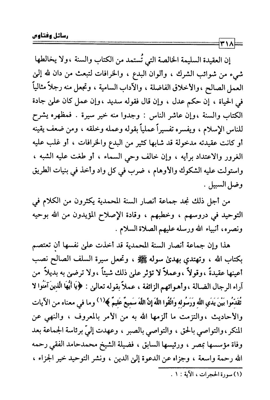 هذا وإن جماعة أنصار السنة المحمدية قد أخذت على نفسها أن تعتصم بكتاب الله، وتهتدي بهدي الرسول صلى الله عليه وسلم، وتجعل سيرة السلف الصالح نصب أعينها عقيدة، وقولا، وعملا لا تؤثر على ذلك شيئا، ولا ترضى به بديلا من آراء الرجال الضالة، وأهوائهم الزائفة، عملا بقوله تعالى: {يَا أَيُّهَا الَّذِينَ آمَنُوا لَا تُقَدِّمُوا بَيْنَ يَدَيِ اللَّهِ وَرَسُولِهِ وَاتَّقُوا اللَّهَ إِنَّ اللَّهَ سَمِيعٌ عَلِيمٌ} وما في معناه من الآيات والأحاديث، والتزمت ما ألزمها الله به من الأمر بالمعروف، والنهي عن المنكر، والتواصي بالحق، والتواصي بالصبر، وعهدت إلي برئاسة الجماعة بعد وفاة مؤسسها بمصر، ورئيسها السابق، فضيلة الشيخ محمد حامد الفقي رحمه الله رحمة واسعة، وجزاه عن الدعوة إلى الدين، ونشر التوحيد خير الجزاء