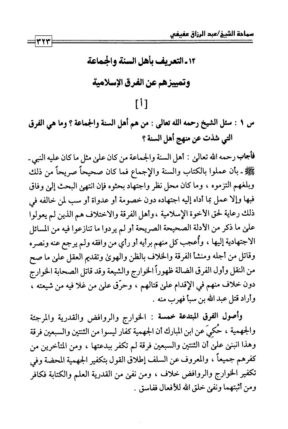 كتاب فتاوى ورسائل سماحة الشيخ عبد الرزاق عفيفي - قسم العقيدة
