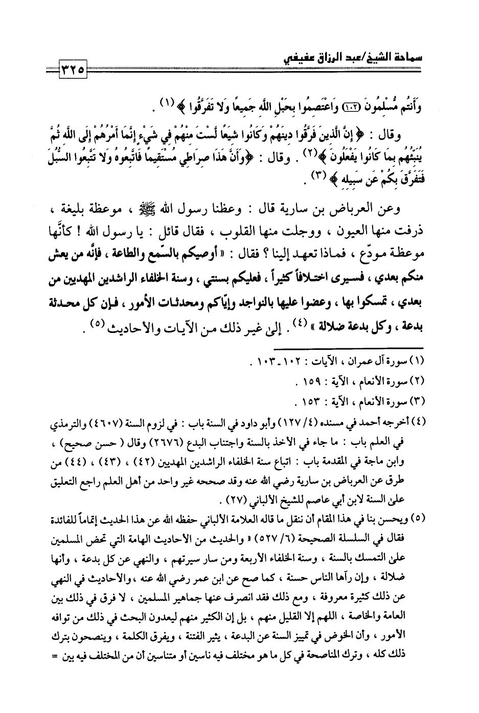وعن العرباض بن سارية قال: «وعظنا رسول الله صلى الله عليه وسلم موعظة بليغة، ذرفت منها العيون، ووجلت منها القلوب، فقال قائل: يا رسول الله! كأنها موعظة مودع، فماذا تعهد إلينا؟ فقال: أوصيكم بالسمع والطاعة، فإنه من يعش منكم بعدي، فسيرى اختلافا كثيرا، فعليكم بسنتي، وسنة الخلفاء الراشدين المهديين من بعدي، تمسكوا بها، وعضوا عليها بالنواجذ وإياكم ومحدثات الأمور، فإن كل محدثة بدعة، وكل بدعة ضلالة» إلى غير ذلك من الآيات والأحاديث.
