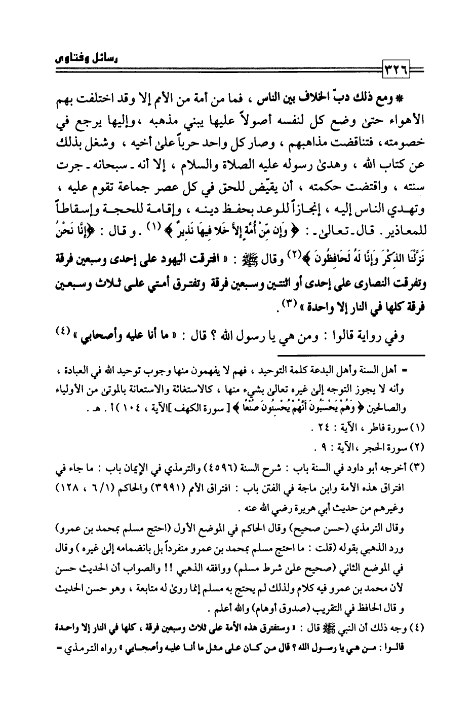 ومع ذلك دب الخلاف بين الناس، فما من أمة من الأمم إلا وقد اختلفت بهم الأهواء حتى وضع كل لنفسه أصولا عليها يبني مذهبه، وإليها يرجع في خصومته، فتناقضت مذاهبهم، وصار كل واحد حربا على أخيه، وشغل بذلك عن كتاب الله، وهدي رسوله عليه الصلاة والسلام، إلا أنه -سبحانه- جرت سنته، واقتضت حكمته، أن يقيض للحق في كل عصر جماعة تقوم عليه، وتهدي الناس إليه، إنجازا للوعد بحفظ دينه، وإقامة للحجة وإسقاطا للمعاذير، قال -تعالى-: {وَإِنْ مِنْ أُمَّةٍ إِلَّا خَلَا فِيهَا نَذِيرٌ} ، وقال: {إِنَّا نَحْنُ نَزَّلْنَا الذِّكْرَ وَإِنَّا لَهُ لَحَافِظُونَ} وقال صلى الله عليه وسلم: «افترقت اليهود على إحدى وسبعين فرقة وتفرقت النصارى على إحدى أو اثنتين وسبعين فرقة وتفترق أمتي على ثلاث وسبعين فرقة كلها في النار إلا واحدة» .