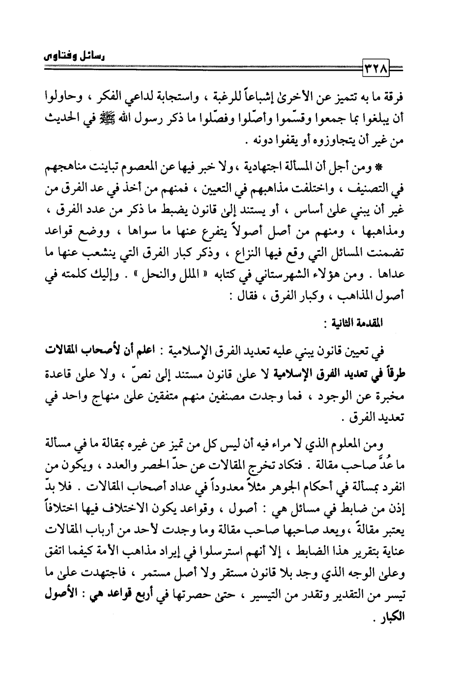 في تعيين قانون يبني عليه تعديد الفرق الإسلامية: اعلم أن لأصحاب المقالات طرقا في تعديد الفرق الإسلامية لا على قانون مستند إلى نص، ولا على قاعدة مخبرة عن الوجود، فما وجدت مصنفين منهم متفقين على منهاج واحد في تعديد الفرق.